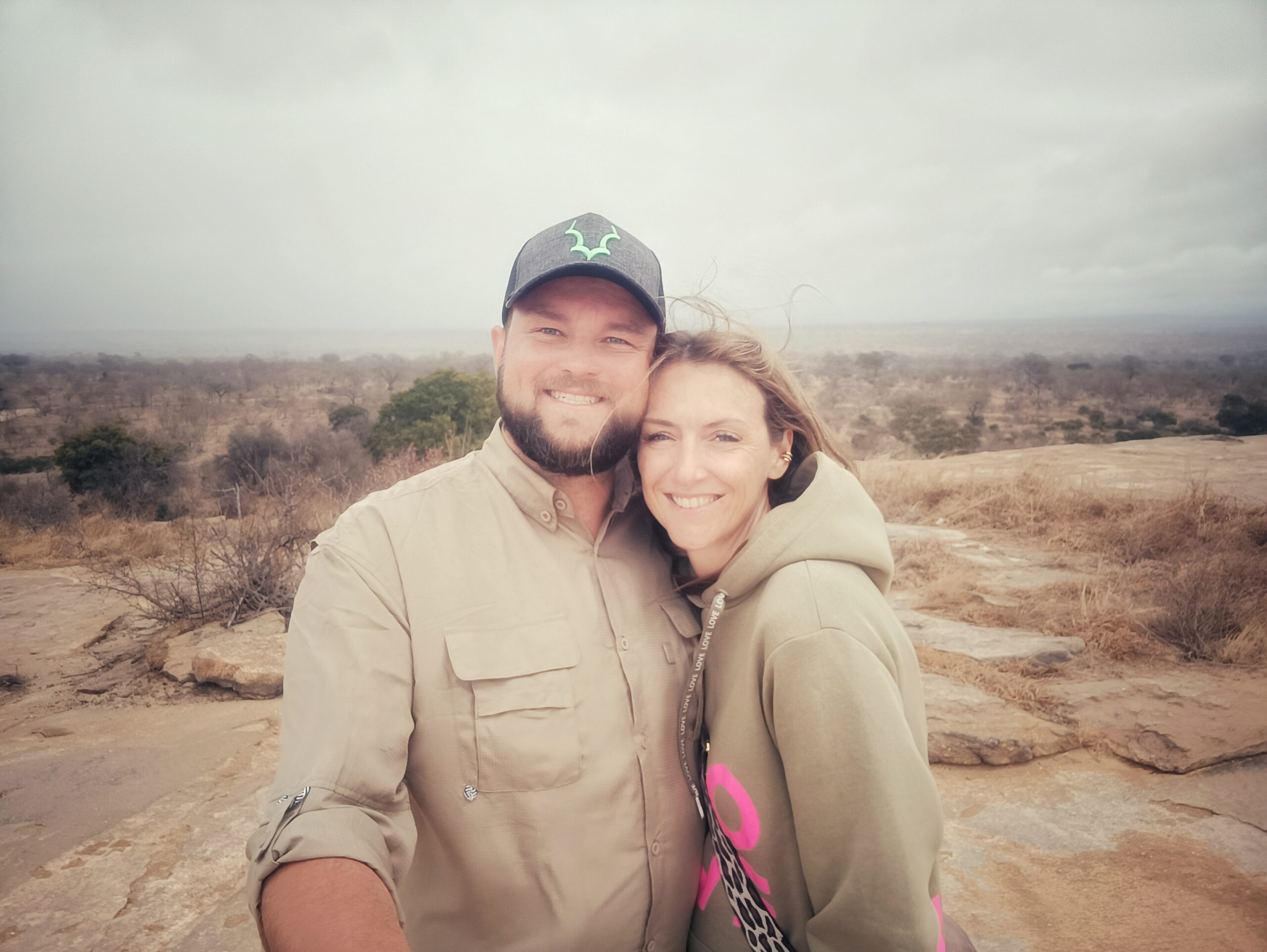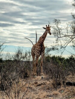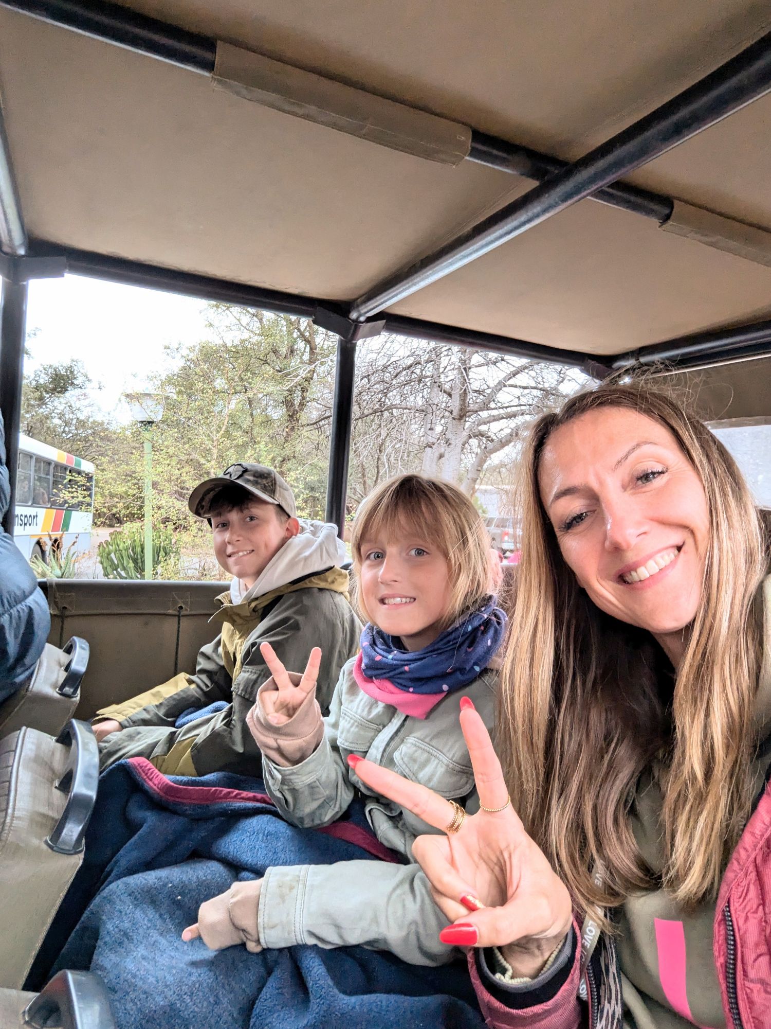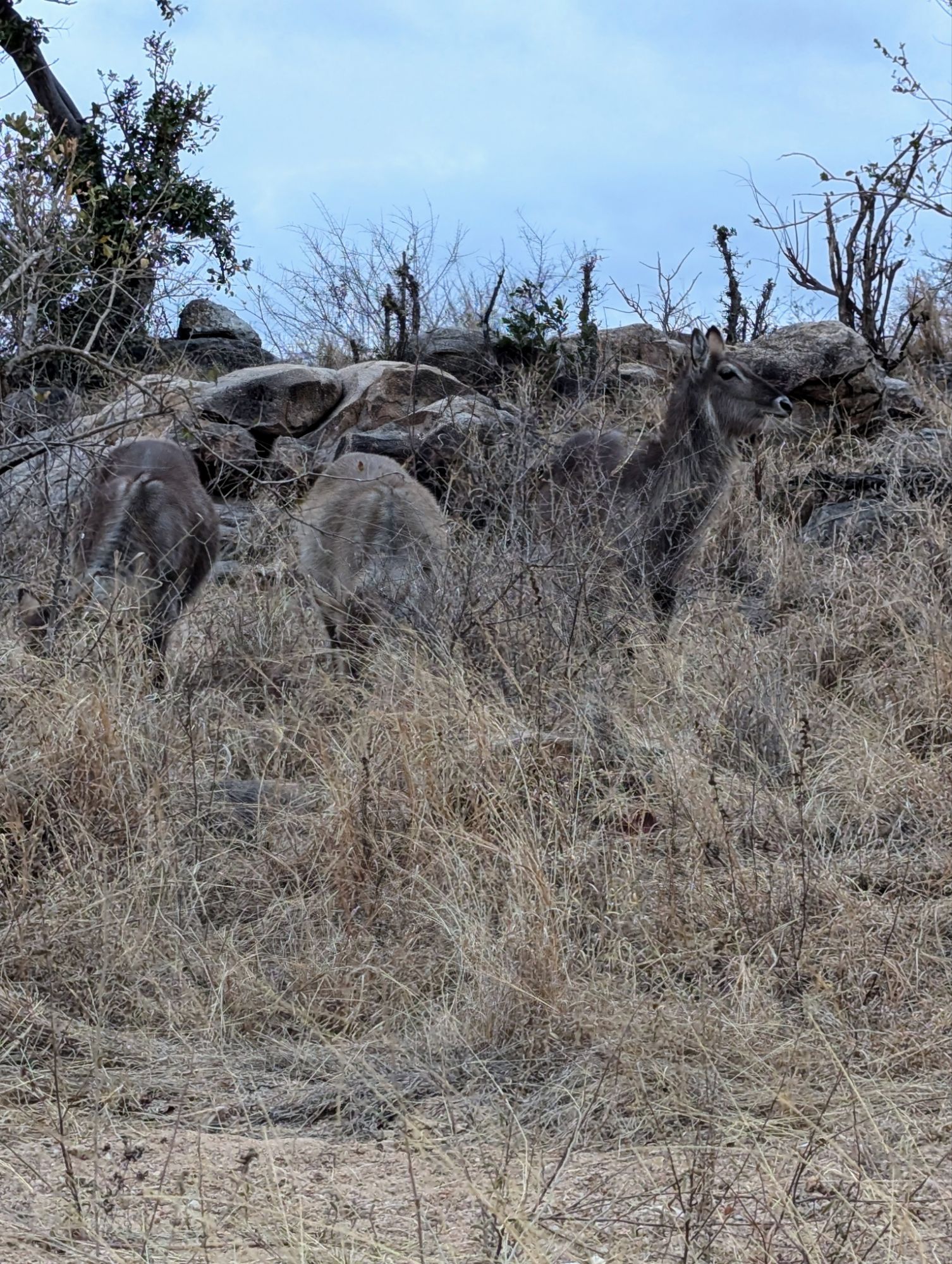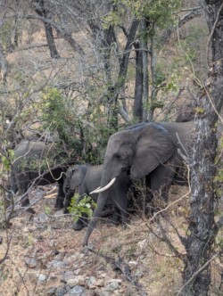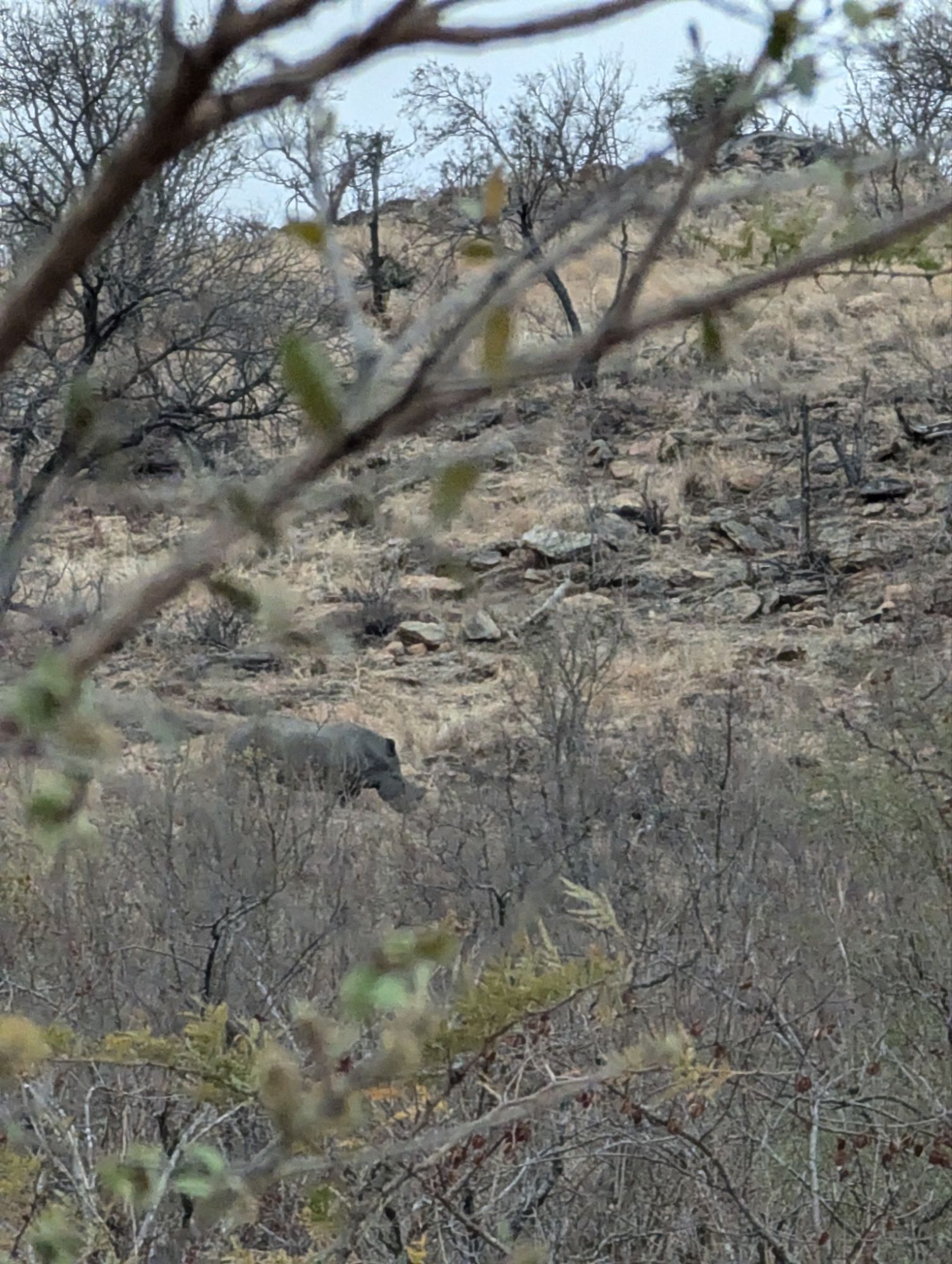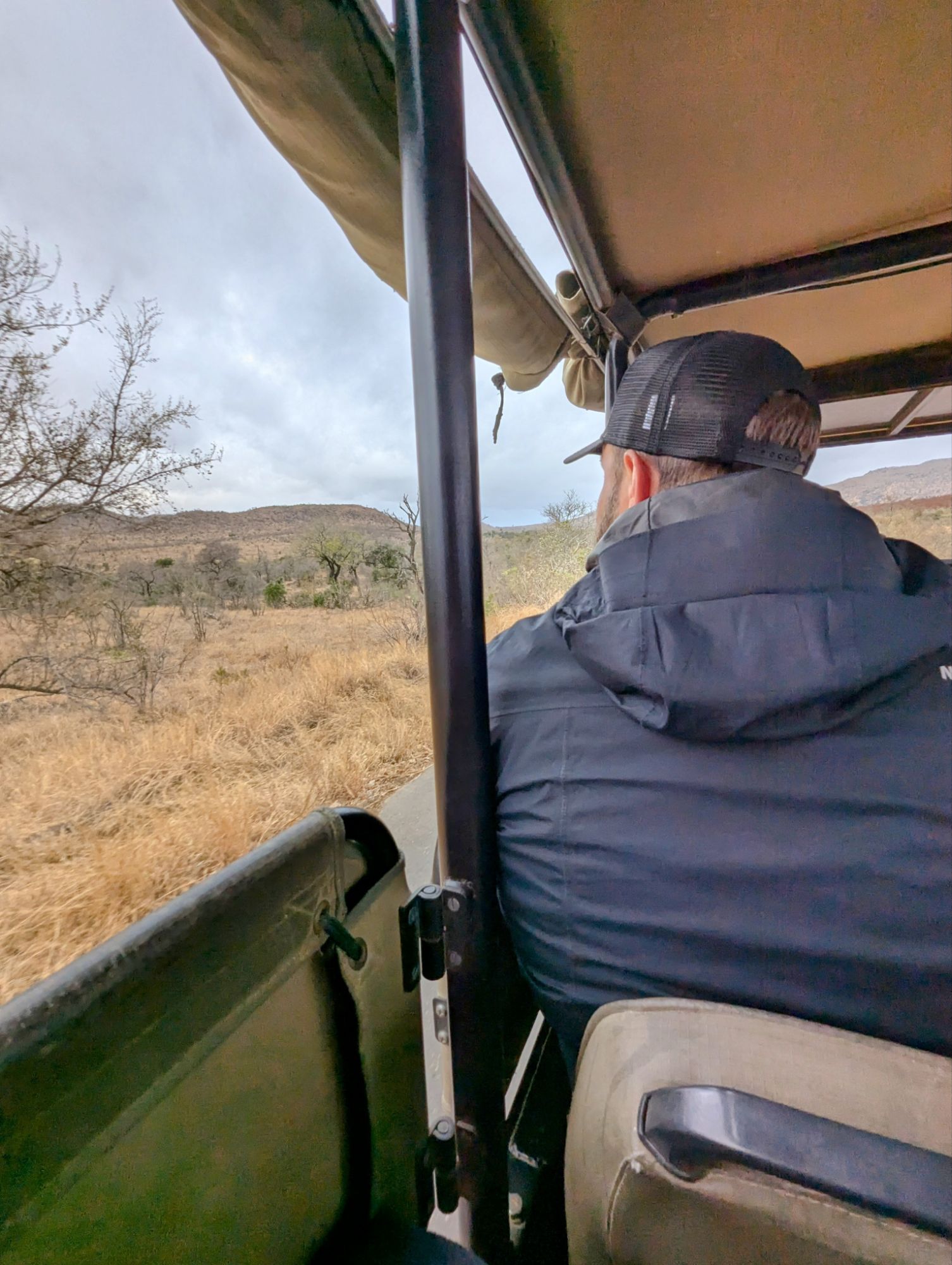 Etwa 16 Uhr kamen wir wieder an und dann nach ganz kurzer Pause ging es schon in den offenen Safari- Jeep. Wir durften uns auch ein Tier wünschen….natürlich LÖWE❗❗❗ (Der von heute morgen war ja kaum zu erkennen)!!! Mal schauen, ob das klappt🙏🏼. Eine weitere Familie gesellte sich zu uns. Direkt nach wenigen Minuten entdeckte ich, Mama mit Superaugen, eine weißes Nashorn direkt an einem Berg. Nashörner sind im Krüger schwer zu finden, da es nur wenige gibt und ihre Standorte nicht öffentlich geteilt werden dürfen, um sie vor Wilderern zu schützen. Was ein Glück🍀! Leider sind sie meist auch weit entfernt von den Autos, so dass Nahaufnahmen sehr schwer sind. Mit dem Fernglas hatten wir allerdings eine tolle Sicht. Und das Glück blieb uns gewogen. Kurz darauf durften wir noch eine ganze Herde Nashörner bestaunen. Es wurde dann schnell dunkel. Nieselregen und frischer Wind machten die Fahrt dann doch wenig angenehm. Eine Stunde lang sahen wir eigentlich keine Tiere. Meine Hoffnung auf einen Löwen, war dann schnell getrübt😓.