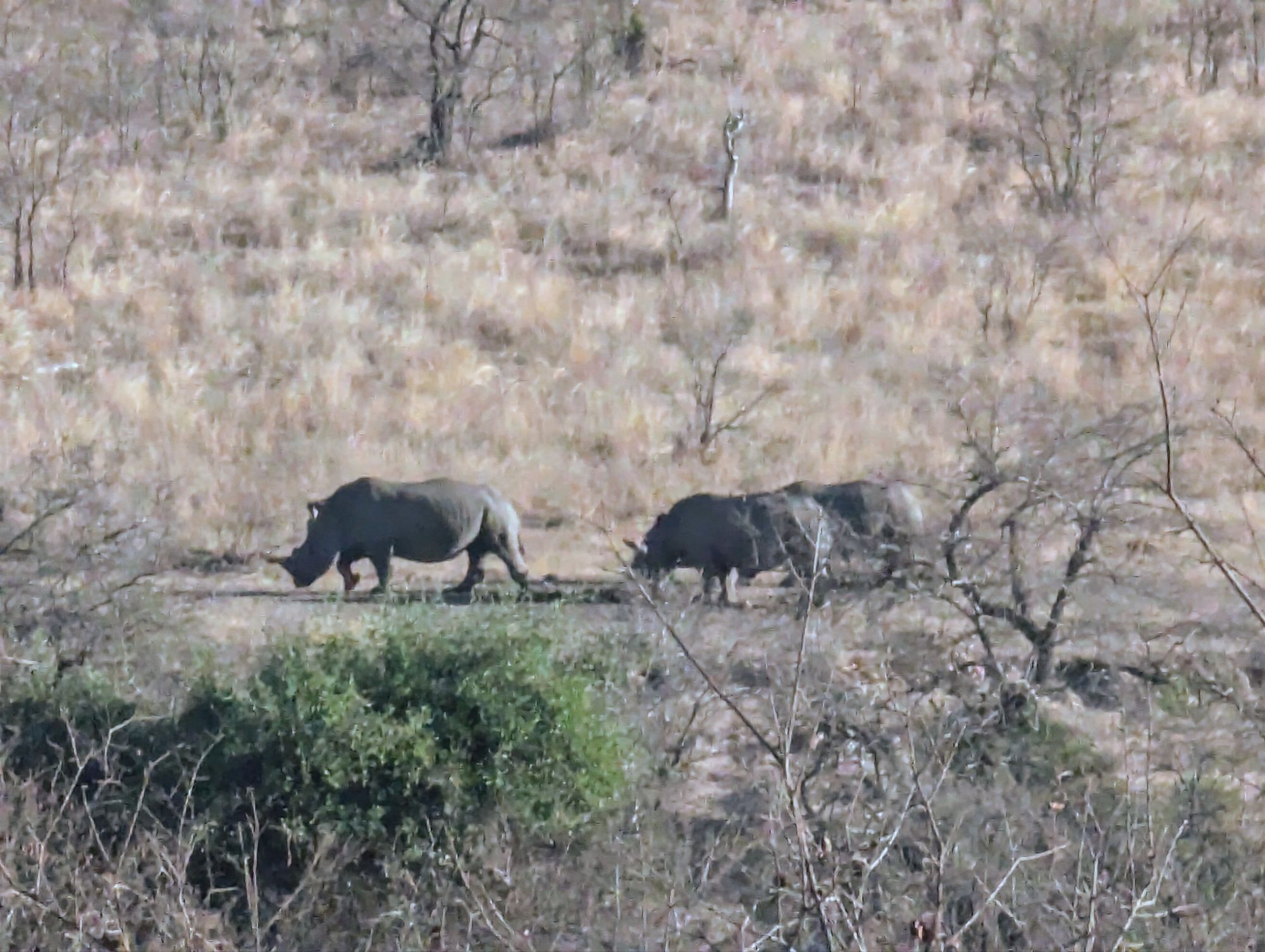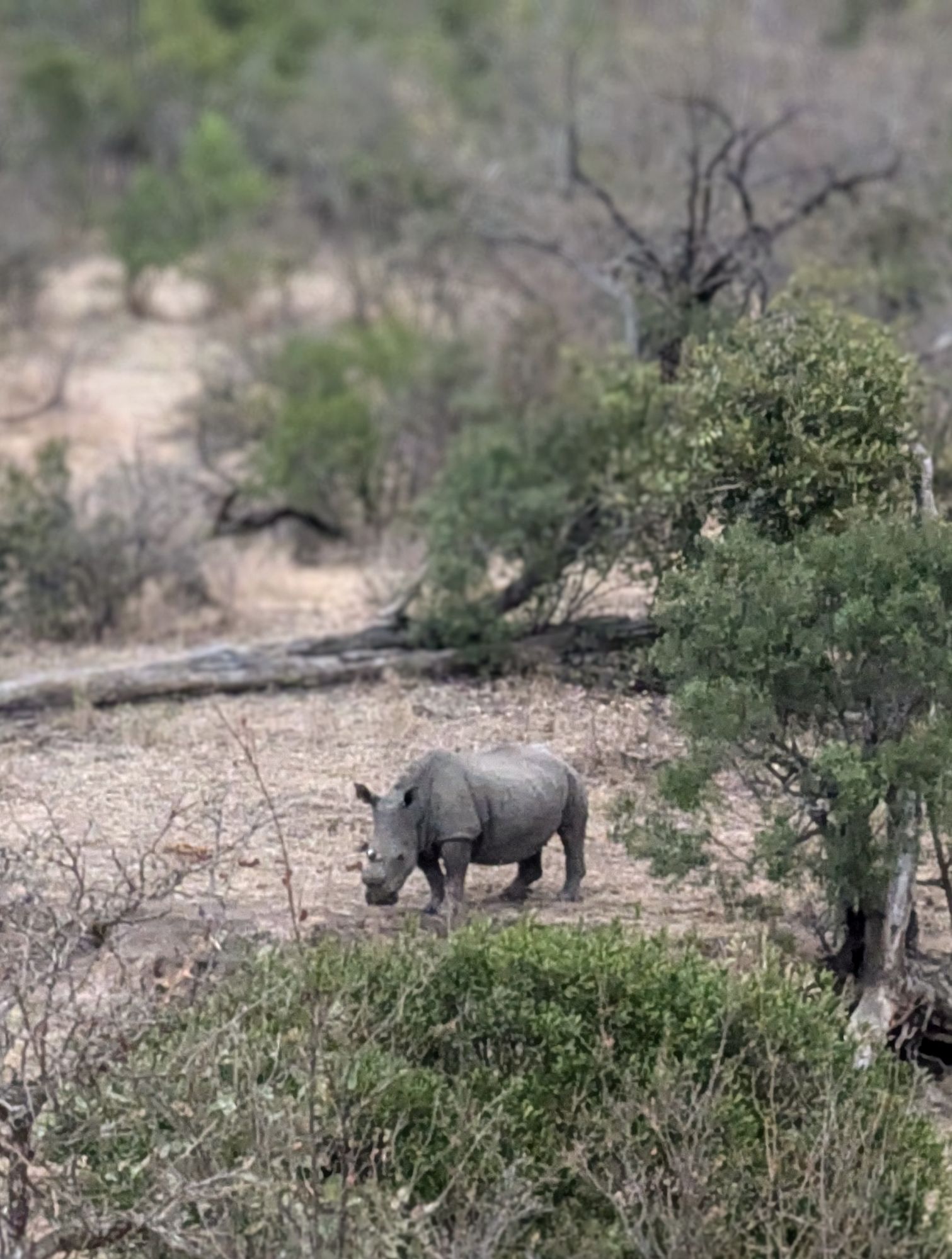 Tag 3 begann für uns etwas entspannter. die letzten Tage waren schon anstrengend. Daher entschieden wir uns für einen ruhigeren Tag. Wir brachen kurz nach 7 Uhr auf und erkundeten die nähere Umgebung rund um das Camp. Es war Zeit endlich mal die Nebenstraßen ausgiebig zu testen. Unsere Suzuki schaffte alle Wege recht mühelos, aber leider ohne viel Komfort. Es rumpelte ziemlich. Belohnt wurden wir aber trotzdem mit vielen Tierbegegnungen. Sogar eine Nashornmama mit Kind war relativ nah am Auto. Leider war das schnelle Bremsen des Autos zu laut und die beiden verschwanden fix im Unterholz🙈😩. So ein Mist.