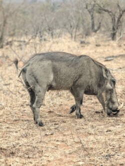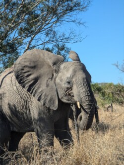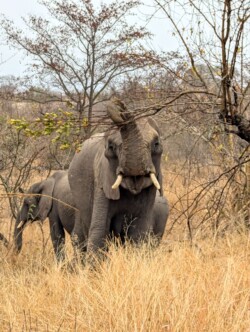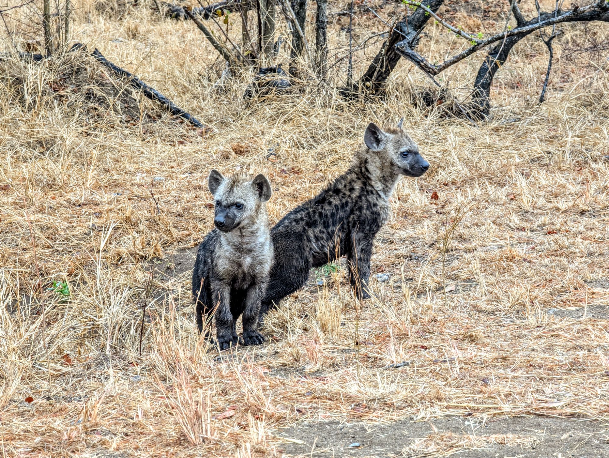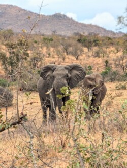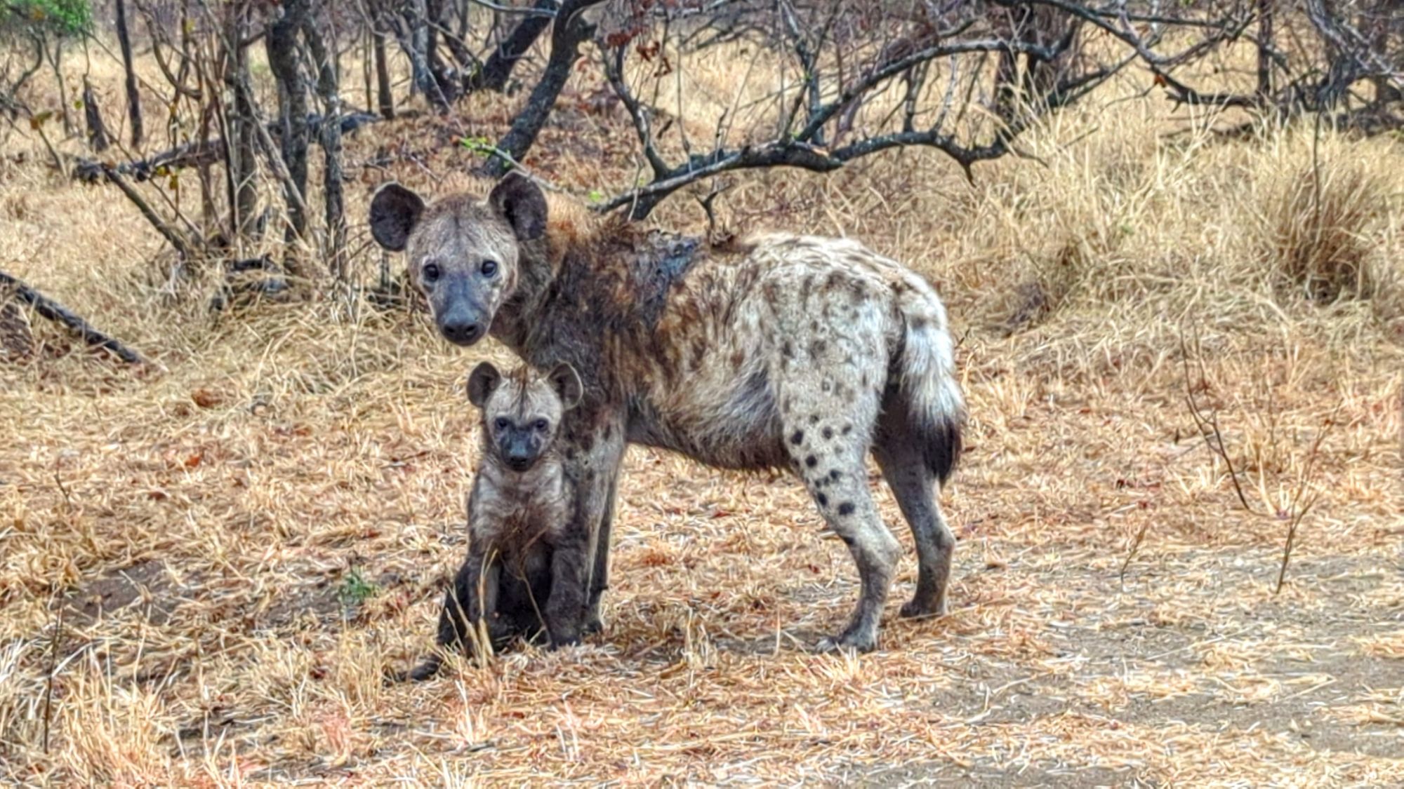 Die Strecke für den Tag betrug ca. 90 km. Auf den Hauptstraßen durfte man 50km/h fahren auf ungeteerten Nebenstraßen maximal 40. Beides absolut utopisch, wenn man auch was sehen möchte. Mit dem Fernglas und unseren beiden Superspionen auf dem Rücksitz ging es los. Es dauerte auch nicht lang und wir konnten auf Anhieb ein Löwenmännchen beobachten. Zwar weit weg und gut getarnt, aber er war da👏🏼. Dann begegneten wir einer Herde Elefanten mit Jungen. Das fühlte sich doch schon sehr besonders an. Kurz darauf kreuzten Hyänen ebenfalls mit Nachwuchs die Straße und wir kamen richtig dicht heran und konnten tolle Aufnahmen machen. Wir hakten fleißig unsere Tierliste in Gedanken ab. Es folgten noch Zebras, Gnus und Strauße bis wir für eine Kaffee- und Pipipause an einem Rastplatz ankamen. Wir hatten gerade mal 30 km geschafft und waren schon 4h unterwegs. Verrückt😳!