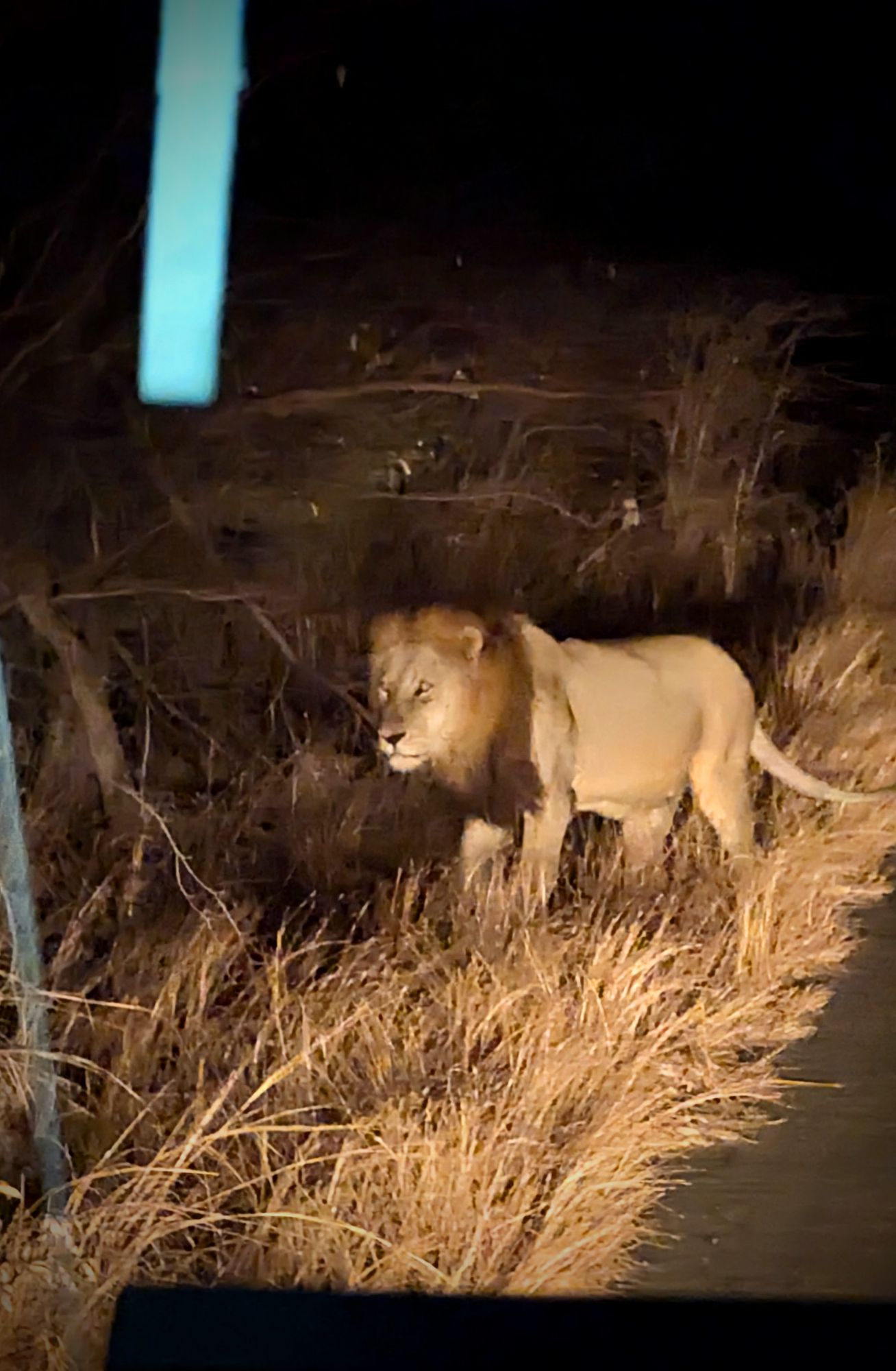 Dann der Anruf eines Ranger- Kollegen: Löwe in der Nähe! Also Gas geben und tatsächlich…. eine Löwenmännchen trabte über die Straße und machte es sich nicht weit entfernt im Gebüsch gemütlich. Wahnsinn🤩!