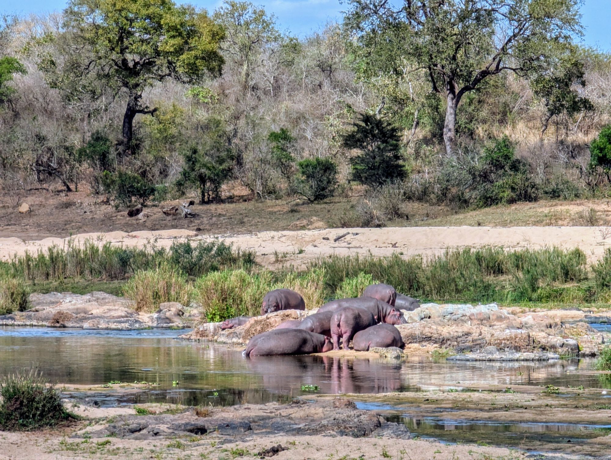Auf dem Weg bestaunten wir dann noch Flusspferde, eine Menge Giraffen, Elefanten und Zebras. Das Crocodile Bridge Camp erreichten wir schon am Vormittag nach Plan. Kurz die Reserven aufgefüllt und die Beine vertreten. Dann ging es schon weiter. Zur Mittagszeit kamen wir auch schon am Lower Sabie an . Das Camp war wirklich toll. Das Restaurant war direkt am Fluss. Die Sonnte lachte und wir freuten uns über die Aussicht auf Elefanten im Wasser und trinkende Giraffen, was btw wirklich witzig aussieht.