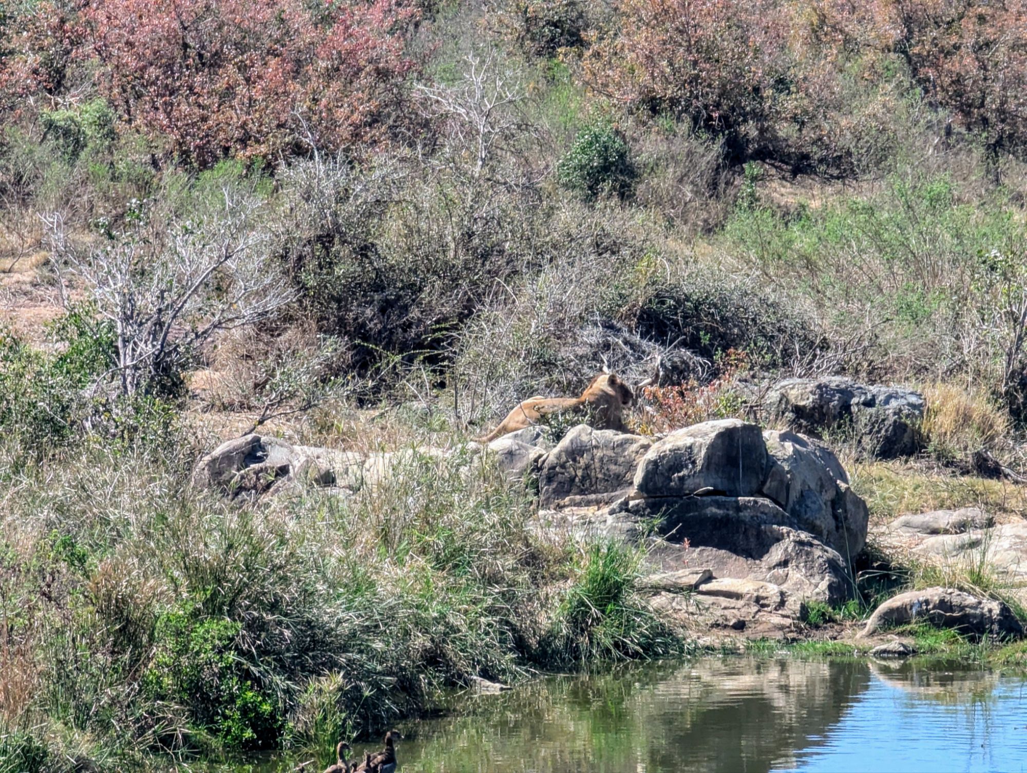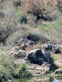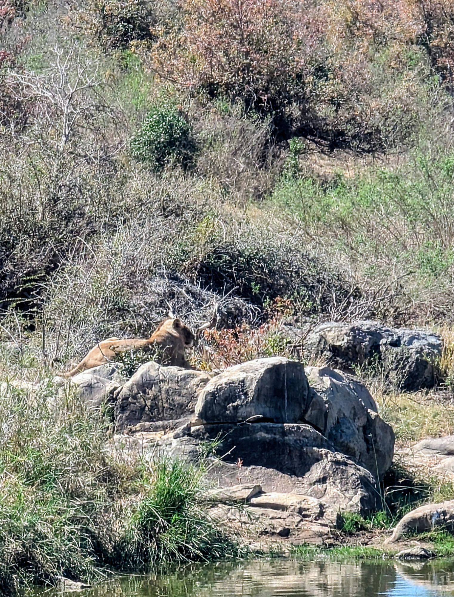 Die Landschaft ist hier um das Lower Sabie- Camp auch ganz anders. Offene Steppe und Gras prägen das Bild. Perfekt für Großkatzen. Mit neuer App auf dem Handy erfuhren wir auch, dass in der Nähe eine Löwe sein soll. Also mal los. Die Autos stapelten sich bereits. Helene machte dann die entscheidende Sichtung💪🏼. Ein Löwenweibchen chillte in der Sonne auf einem Stein. Es war großartig.