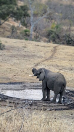 Am Nachmittag kehrten wir zurück zum Camp und die Kinder machten es sich gemütlich im Haus. Toni und ich fuhren dann nochmal zum Wasserloch um die Ecke. Ein toller Spot, wenn zur Dämmerung dort Elefanten, Zebras und Büffel erscheinen und sich erfrischen. Eine Giraffe kreuzte auch direkt auf dem Hinweg die Straße und es war spektakulär, wie nah sie am Auto vorbeilief. Kurz vor der Rückfahrt überraschte uns noch ein riesiger Elefant, der zum Trinken kam.