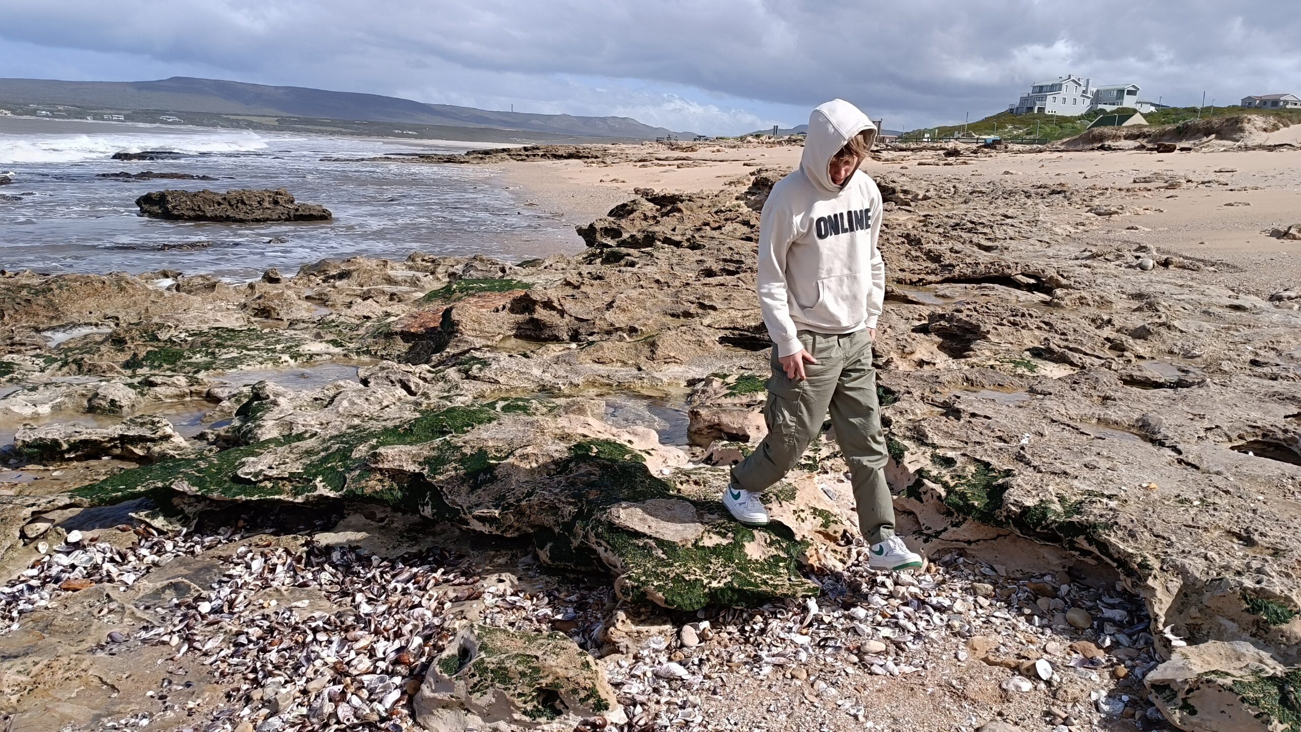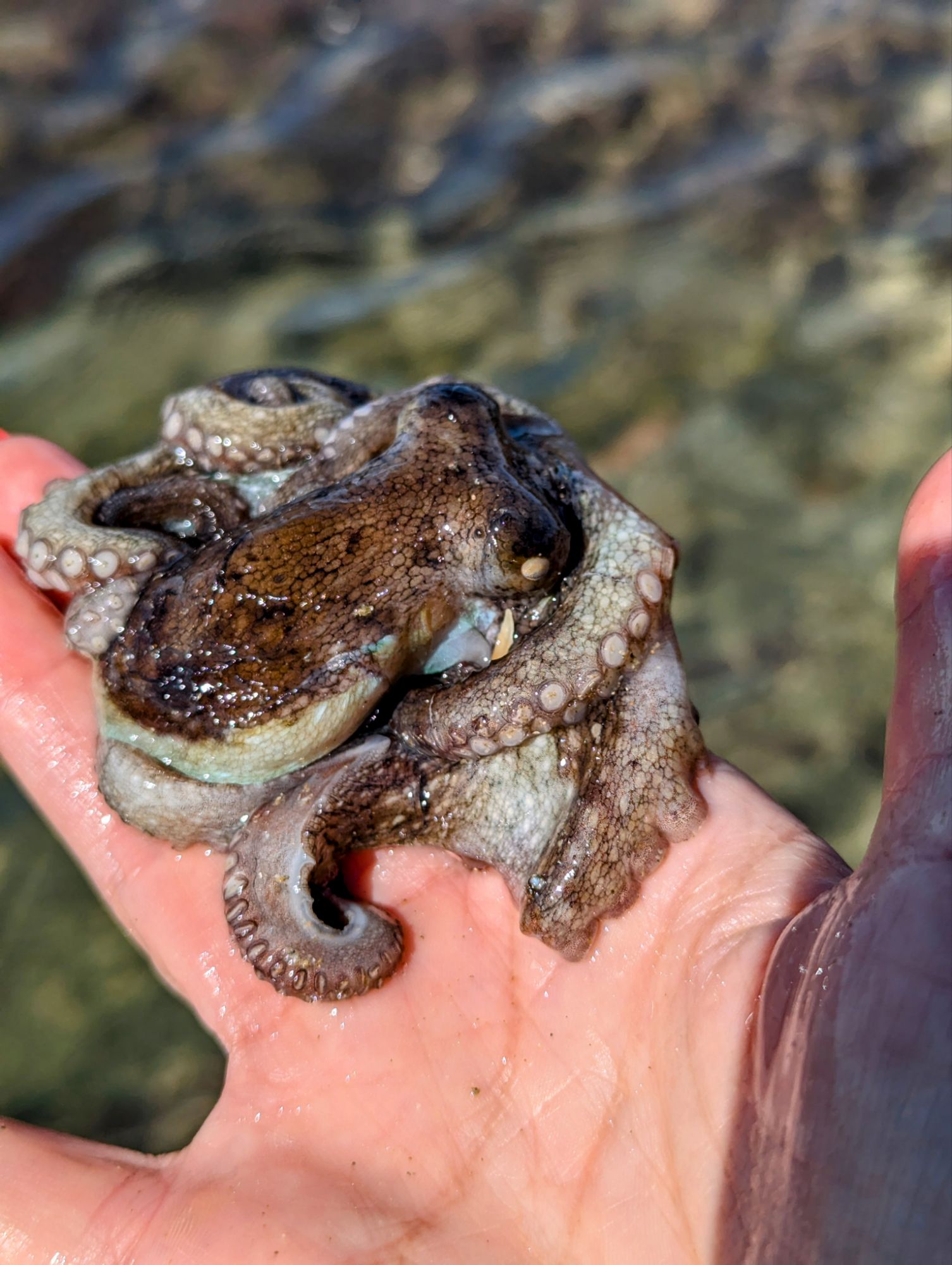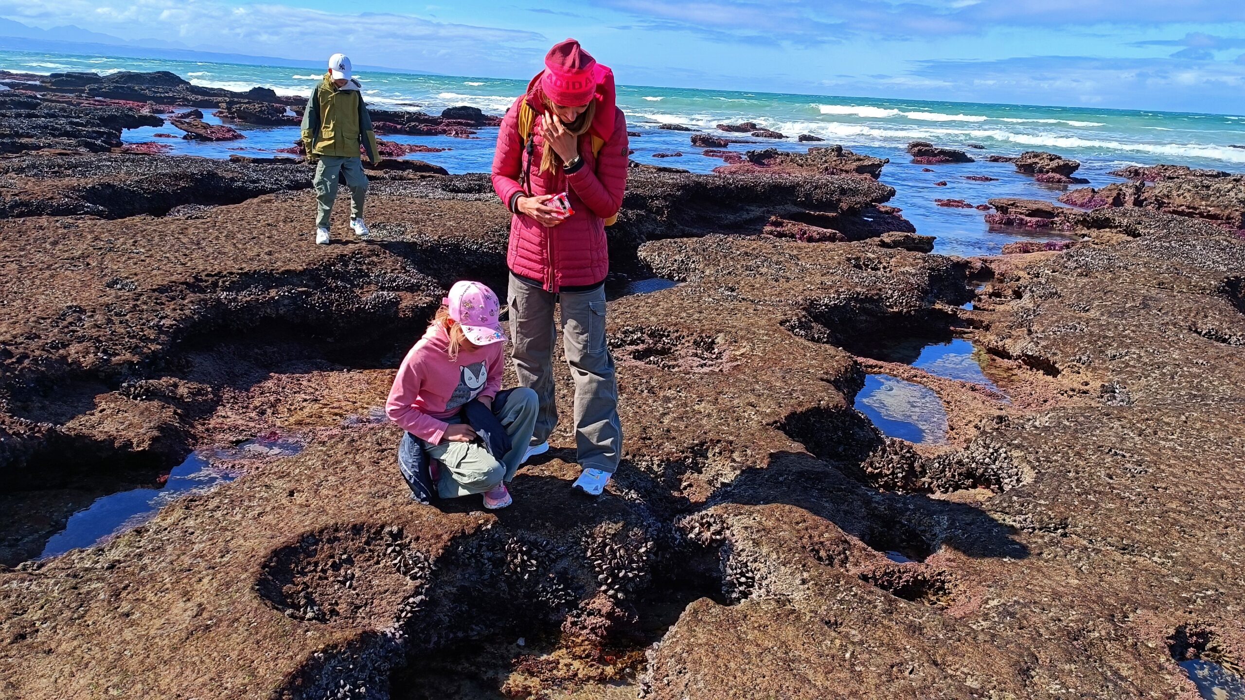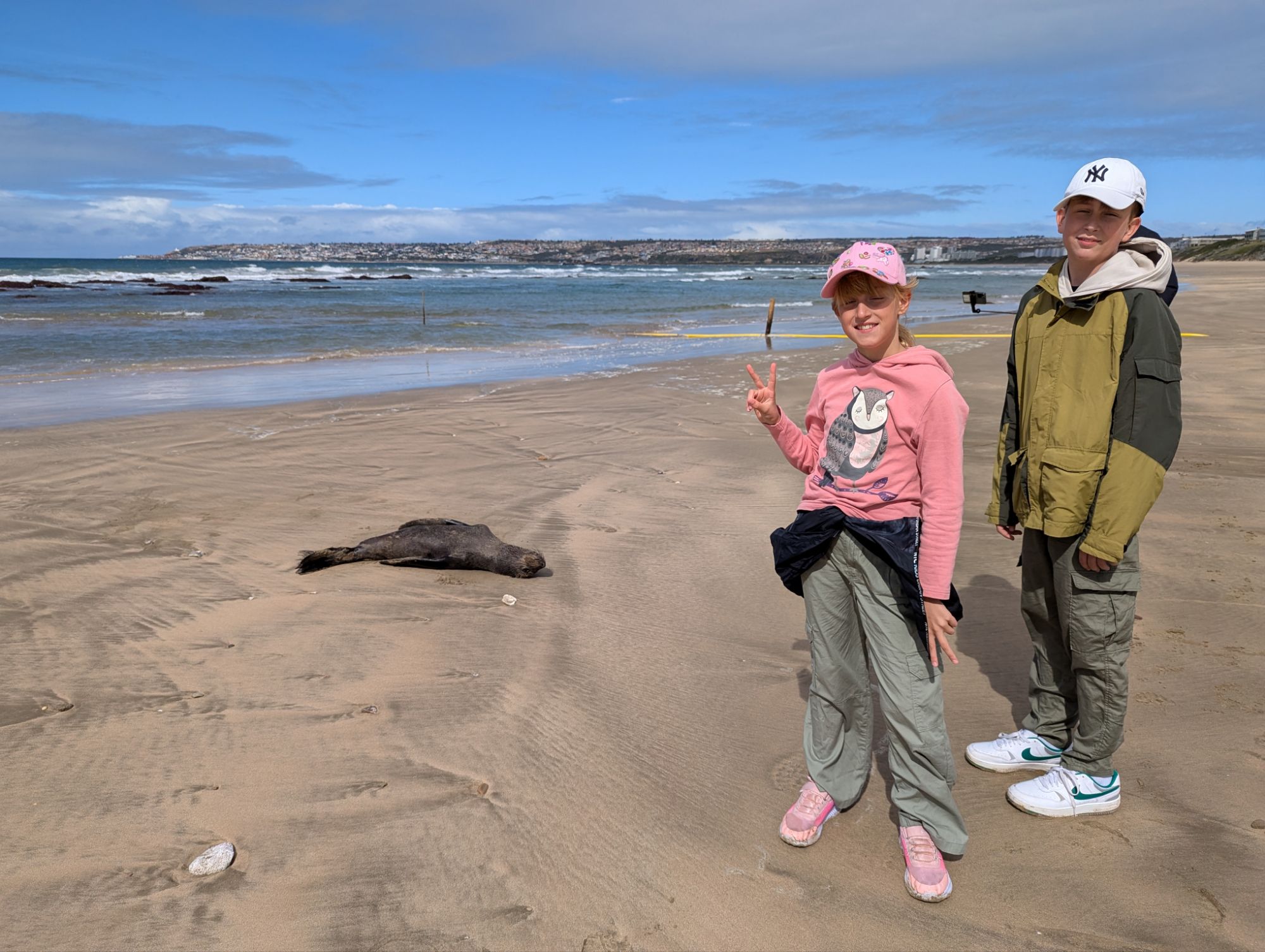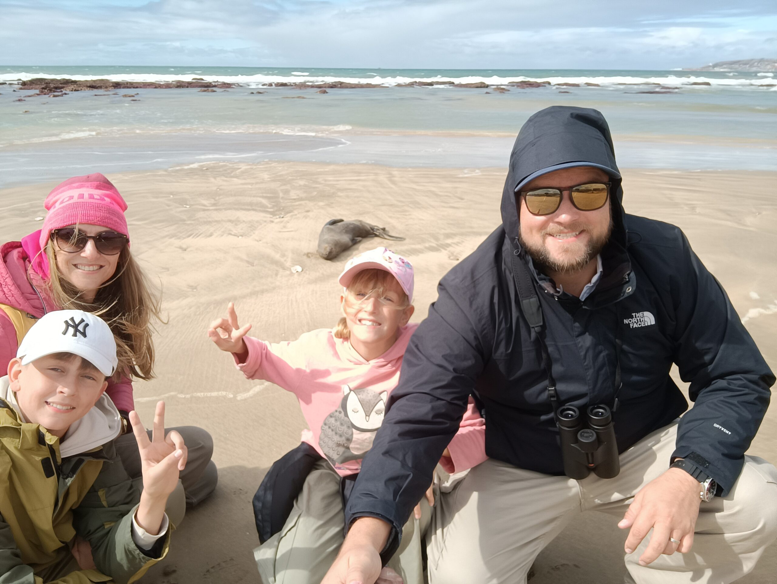 Wir entschieden uns für einen Entdeckungstag am Strand und packten unsere 7 Sachen zusammen. Nach ca. 15 Minuten Fahrt erreichten wir den Diaz Beach, ein langgezogener Sandstrand ungefähr in der Mitte der Bucht. Kräftiger Wind machte alle Hoffnungen auf einen Drohnenflug zunichte. Egal, dann eben ohne! Nach kurzem Fußmarsch erwartete uns schon ein kleiner Seehund🦭, der sich in in der Sonne aalte und kaum Scheu vor Menschen hatte. Die Kids waren fasziniert und wir beobachteten das Schauspiel ausgiebig, bevor wir weiterzogen. Es war gerade Ebbe und damit gab es viel zu zu entdecken. Überall waren kleine Gezeitenbecken, die allerhand Leben bereithielten, das man erforschen konnte🐚🐙🐟🪼🦐. Bennet und Helene hatten kleine Wettbewerbe, damit es spannend blieb. Helene fand das größte und schönste Schneckenhaus und Bennet entdeckte das coolste Tier- einen kleinen, gestrandeten Oktopus. Er sah schon nicht mehr ganz lebendig aus. Nach kurzem Reaktionstest entpuppte sich der kleine 8-armige Freund aber als Kämpfer. Mission „Rettung von Tinti“ begann. Ich fasste mir ein Herz und nahm „Tinti“ auf die Hand…ab zum Wasser! Sofort erwachte der kleine Kerl wieder zum Leben und wurde sehr aktiv. Allerdings hatte er mich fest im Griff und machte keine Anstalten seines Weges zu ziehen. An anderer Stelle ließ er direkt mal eine Tintenwolke los. Kurz darauf wusste ich auch warum. Ein weiterer , größerer Arm näherte sich meiner Hand aus dem Hinterhalt😯. Da versteckte sich wohl ein gleichartiger Rivale direkt unter dem Felsen. Also neuen Platz suchen und weiterer Freilassungsversuch….ein kleiner Schubs und 2 Tintenwolken später war „Tinti“ frei. Ein fantastisches Erlebnis❤️.