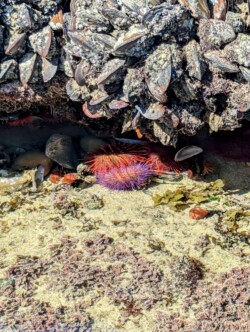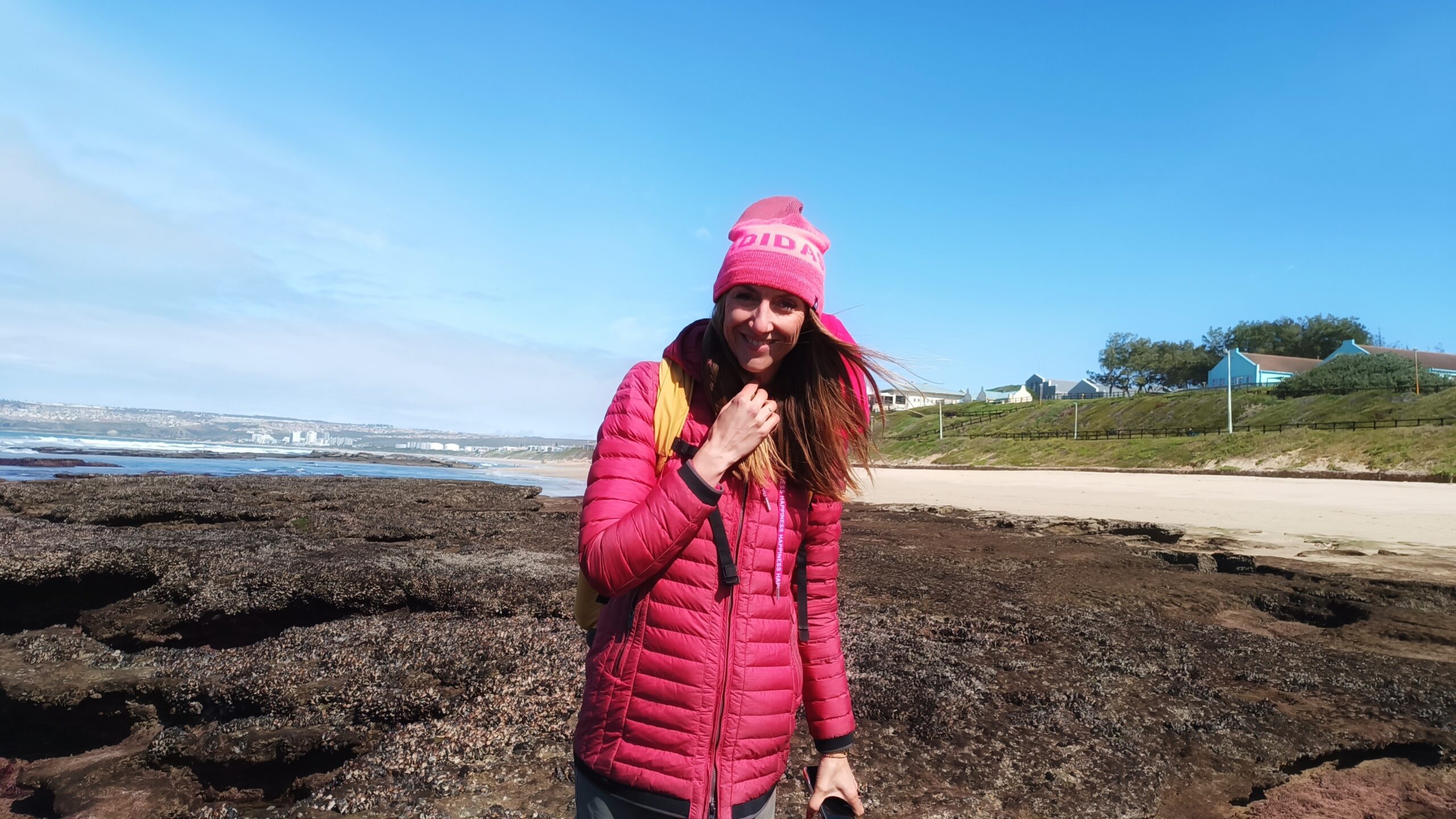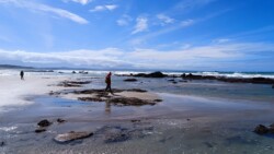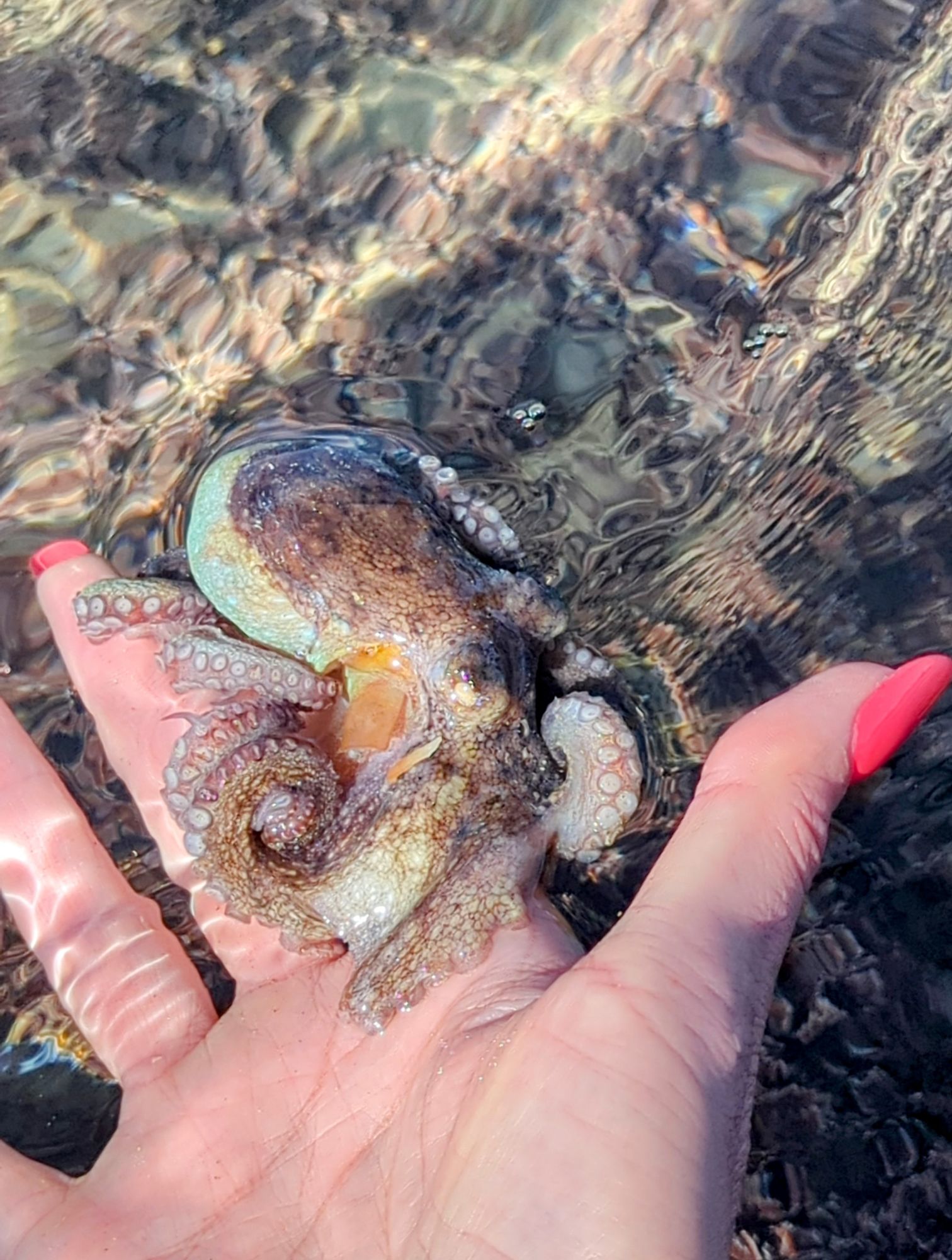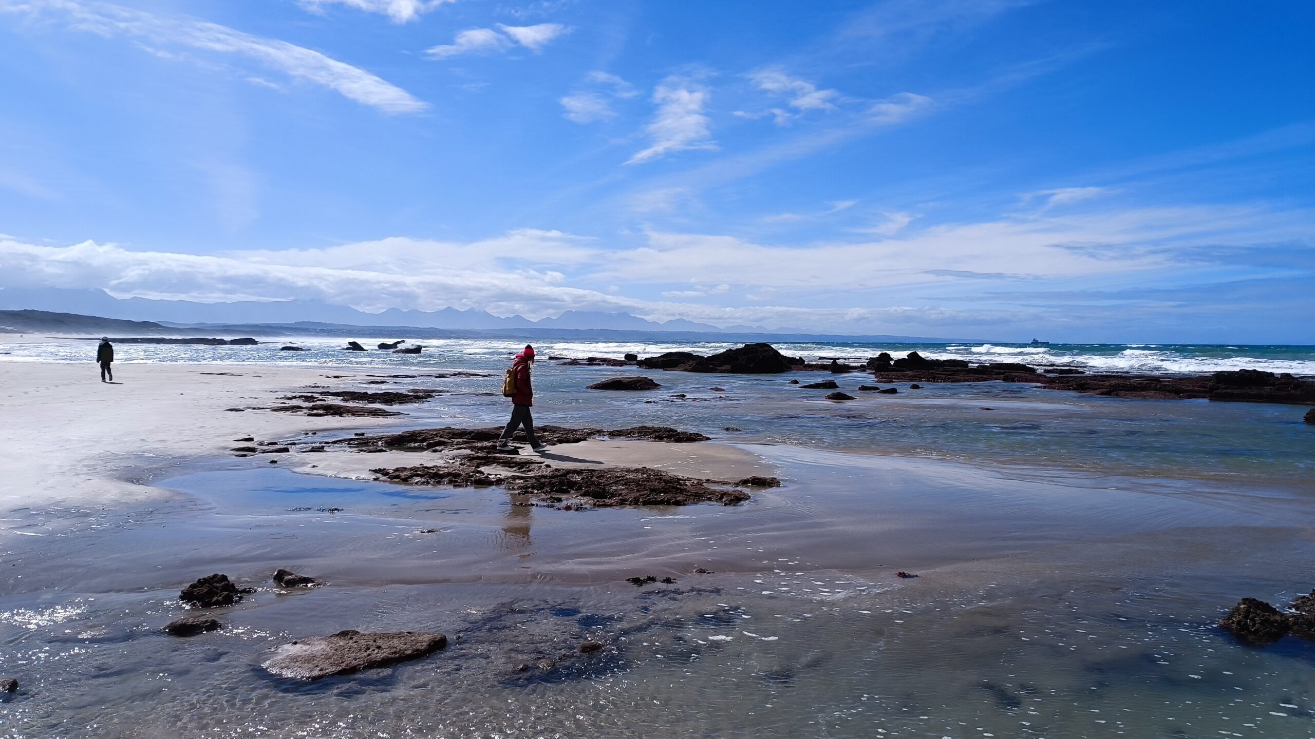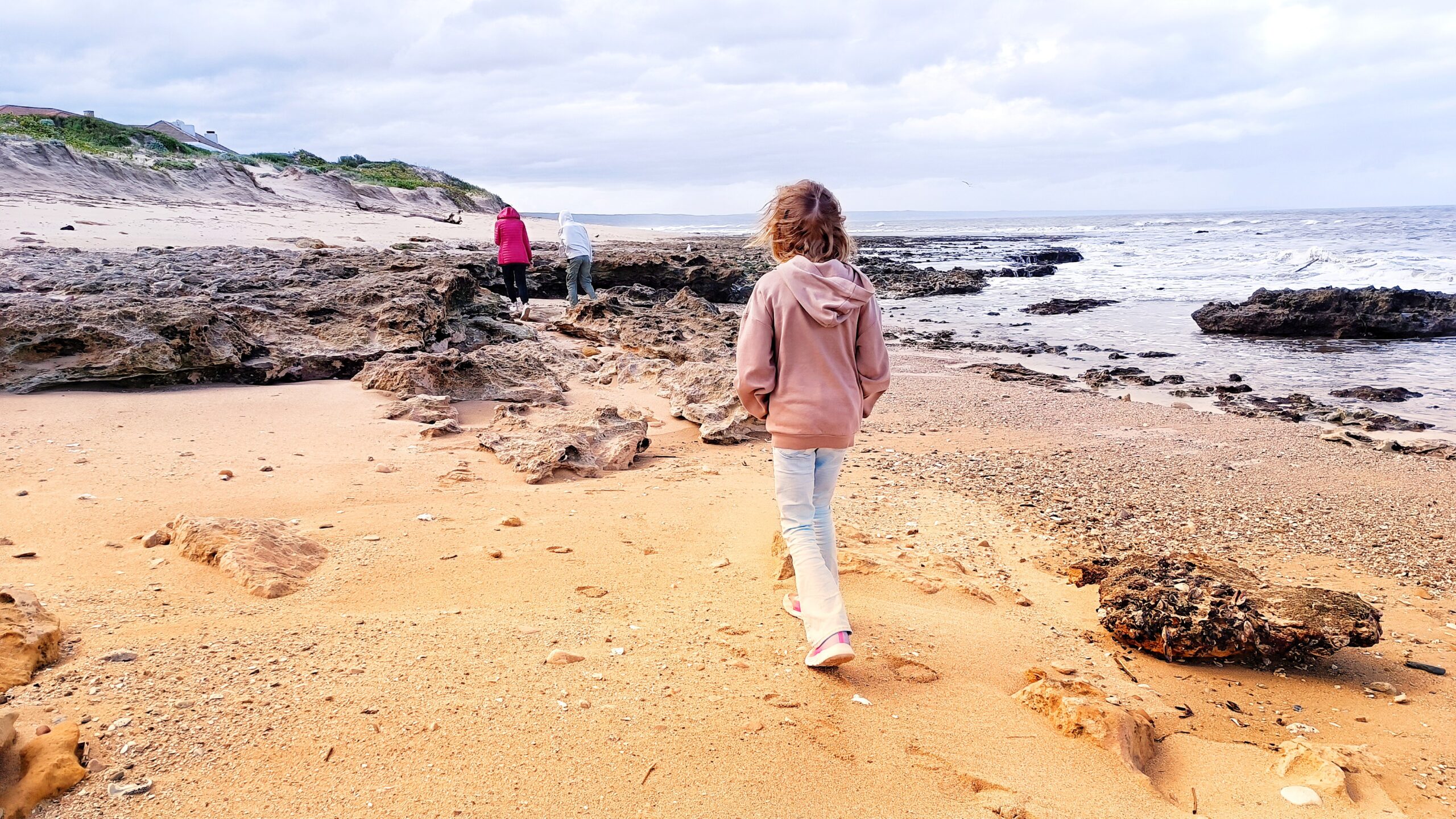 Wir entschieden uns für einen Entdeckungstag am Strand und packten unsere 7 Sachen zusammen. Nach ca. 15 Minuten Fahrt erreichten wir den Diaz Beach, ein langgezogener Sandstrand ungefähr in der Mitte der Bucht. Kräftiger Wind machte alle Hoffnungen auf einen Drohnenflug zunichte. Egal, dann eben ohne! Nach kurzem Fußmarsch erwartete uns schon ein kleiner Seehund🦭, der sich in in der Sonne aalte und kaum Scheu vor Menschen hatte. Die Kids waren fasziniert und wir beobachteten das Schauspiel ausgiebig, bevor wir weiterzogen. Es war gerade Ebbe und damit gab es viel zu zu entdecken. Überall waren kleine Gezeitenbecken, die allerhand Leben bereithielten, das man erforschen konnte🐚🐙🐟🪼🦐. Bennet und Helene hatten kleine Wettbewerbe, damit es spannend blieb. Helene fand das größte und schönste Schneckenhaus und Bennet entdeckte das coolste Tier- einen kleinen, gestrandeten Oktopus. Er sah schon nicht mehr ganz lebendig aus. Nach kurzem Reaktionstest entpuppte sich der kleine 8-armige Freund aber als Kämpfer. Mission „Rettung von Tinti“ begann. Ich fasste mir ein Herz und nahm „Tinti“ auf die Hand…ab zum Wasser! Sofort erwachte der kleine Kerl wieder zum Leben und wurde sehr aktiv. Allerdings hatte er mich fest im Griff und machte keine Anstalten seines Weges zu ziehen. An anderer Stelle ließ er direkt mal eine Tintenwolke los. Kurz darauf wusste ich auch warum. Ein weiterer , größerer Arm näherte sich meiner Hand aus dem Hinterhalt😯. Da versteckte sich wohl ein gleichartiger Rivale direkt unter dem Felsen. Also neuen Platz suchen und weiterer Freilassungsversuch….ein kleiner Schubs und 2 Tintenwolken später war „Tinti“ frei. Ein fantastisches Erlebnis❤️.
