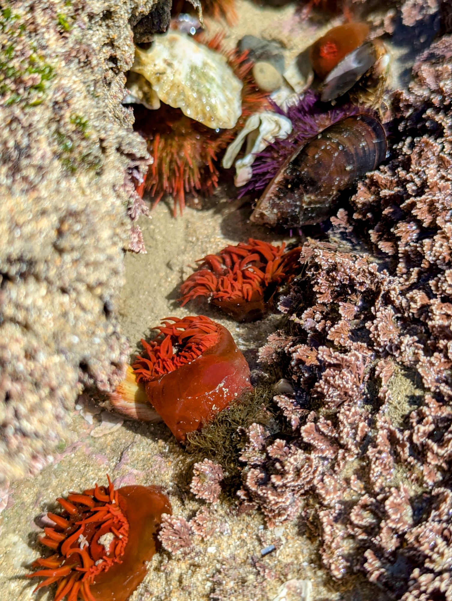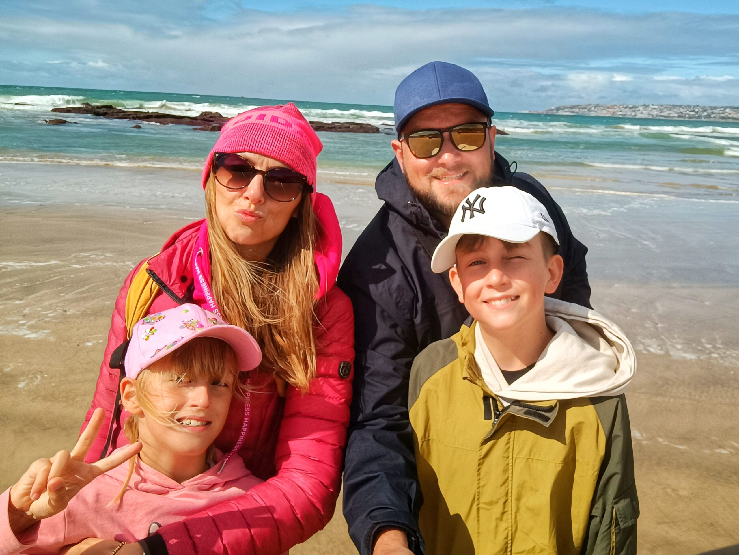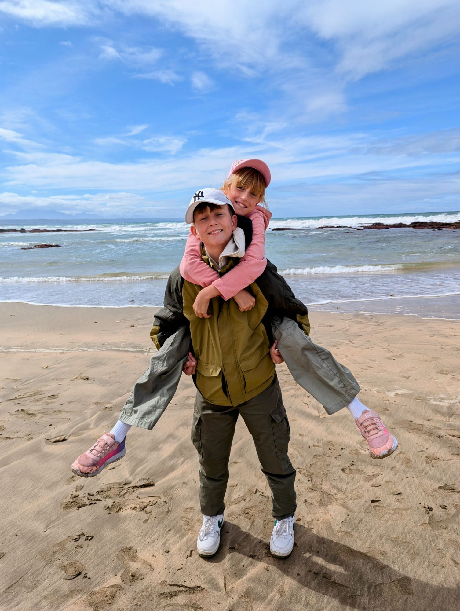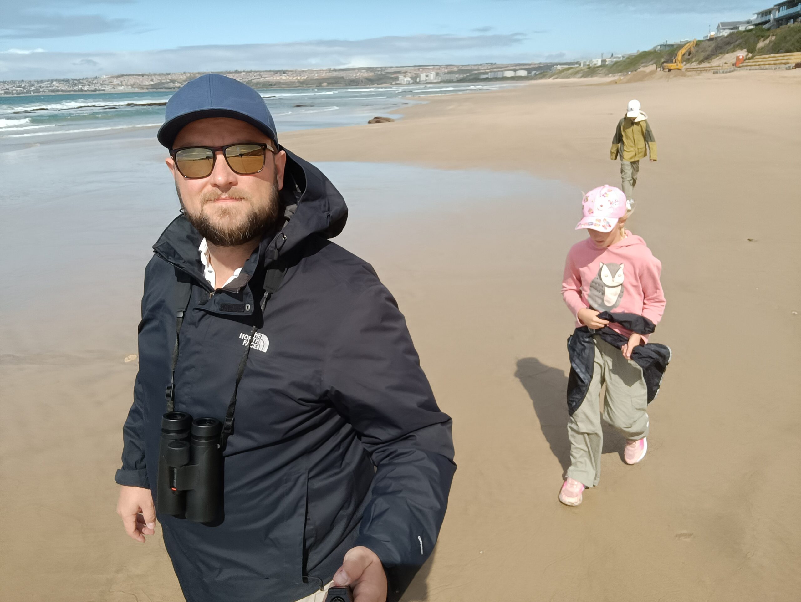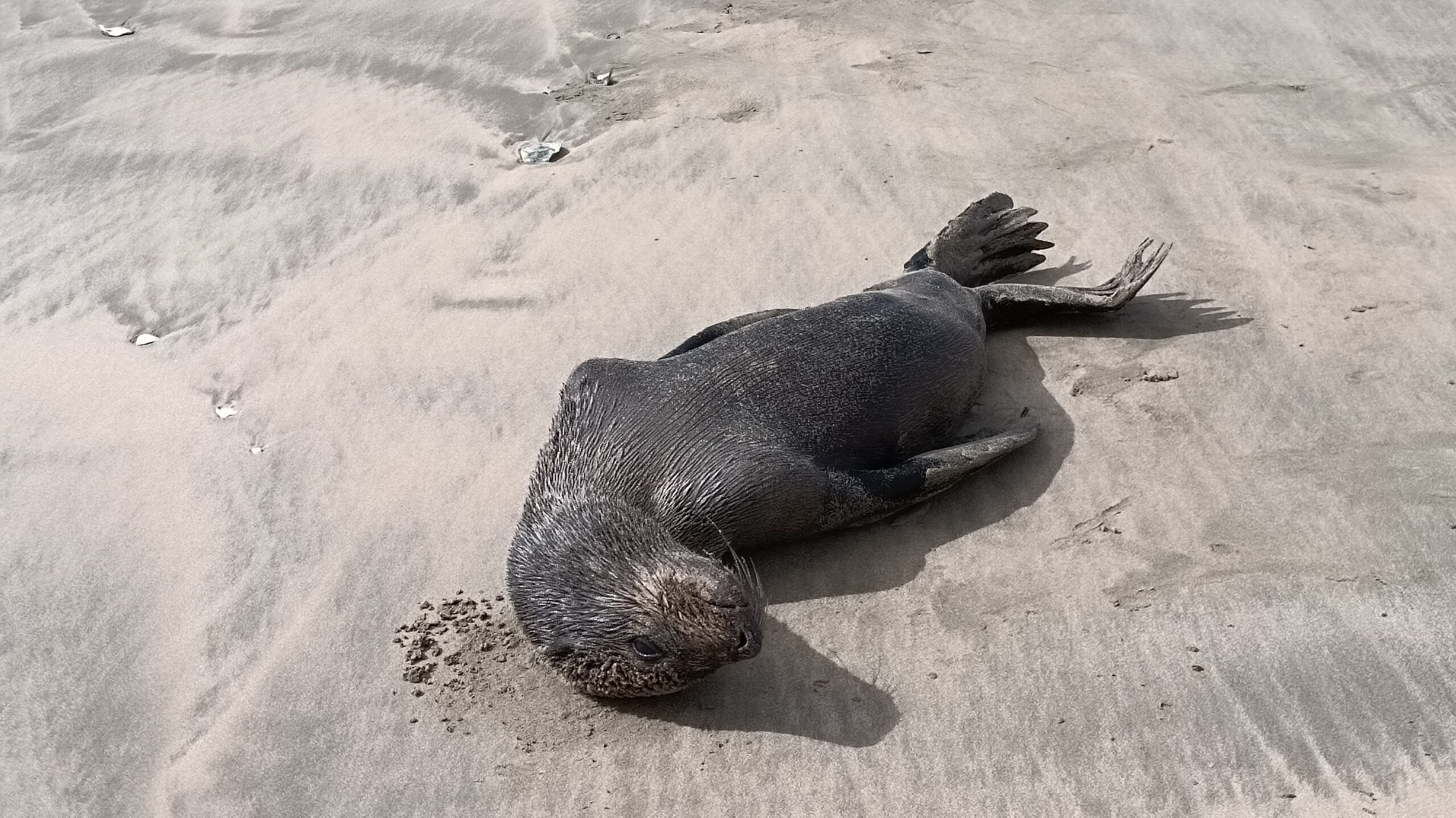 Wir entschieden uns für einen Entdeckungstag am Strand und packten unsere 7 Sachen zusammen. Nach ca. 15 Minuten Fahrt erreichten wir den Diaz Beach, ein langgezogener Sandstrand ungefähr in der Mitte der Bucht. Kräftiger Wind machte alle Hoffnungen auf einen Drohnenflug zunichte. Egal, dann eben ohne! Nach kurzem Fußmarsch erwartete uns schon ein kleiner Seehund🦭, der sich in in der Sonne aalte und kaum Scheu vor Menschen hatte. Die Kids waren fasziniert und wir beobachteten das Schauspiel ausgiebig, bevor wir weiterzogen. Es war gerade Ebbe und damit gab es viel zu zu entdecken. Überall waren kleine Gezeitenbecken, die allerhand Leben bereithielten, das man erforschen konnte🐚🐙🐟🪼🦐. Bennet und Helene hatten kleine Wettbewerbe, damit es spannend blieb. Helene fand das größte und schönste Schneckenhaus und Bennet entdeckte das coolste Tier- einen kleinen, gestrandeten Oktopus. Er sah schon nicht mehr ganz lebendig aus. Nach kurzem Reaktionstest entpuppte sich der kleine 8-armige Freund aber als Kämpfer. Mission „Rettung von Tinti“ begann. Ich fasste mir ein Herz und nahm „Tinti“ auf die Hand…ab zum Wasser! Sofort erwachte der kleine Kerl wieder zum Leben und wurde sehr aktiv. Allerdings hatte er mich fest im Griff und machte keine Anstalten seines Weges zu ziehen. An anderer Stelle ließ er direkt mal eine Tintenwolke los. Kurz darauf wusste ich auch warum. Ein weiterer , größerer Arm näherte sich meiner Hand aus dem Hinterhalt😯. Da versteckte sich wohl ein gleichartiger Rivale direkt unter dem Felsen. Also neuen Platz suchen und weiterer Freilassungsversuch….ein kleiner Schubs und 2 Tintenwolken später war „Tinti“ frei. Ein fantastisches Erlebnis❤️.