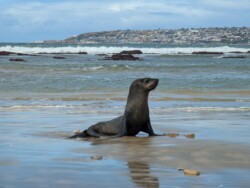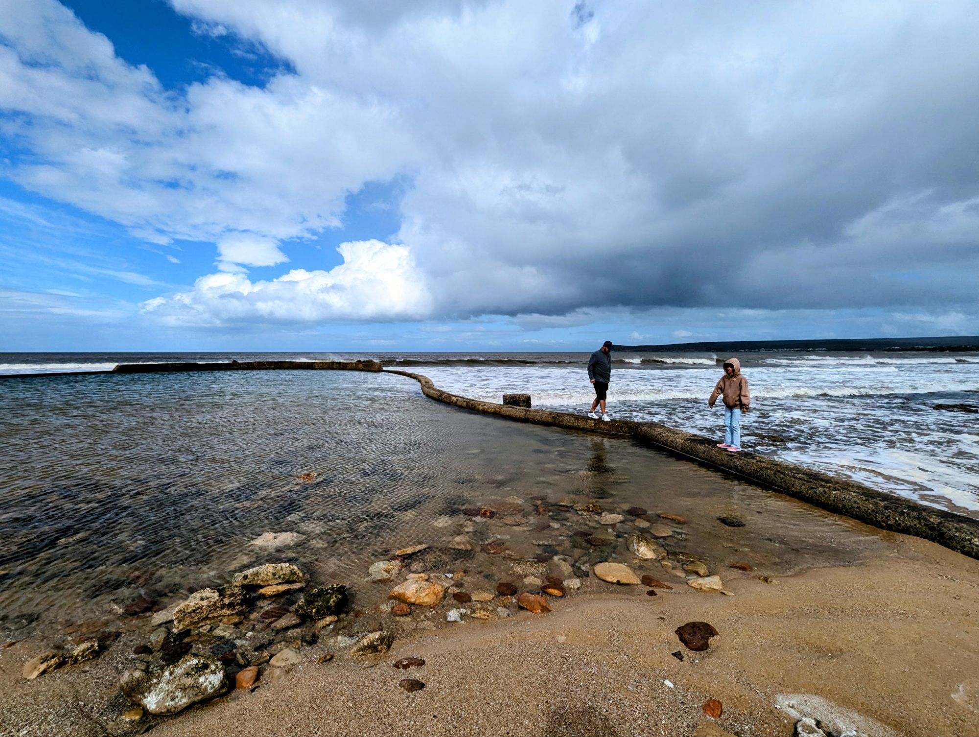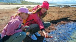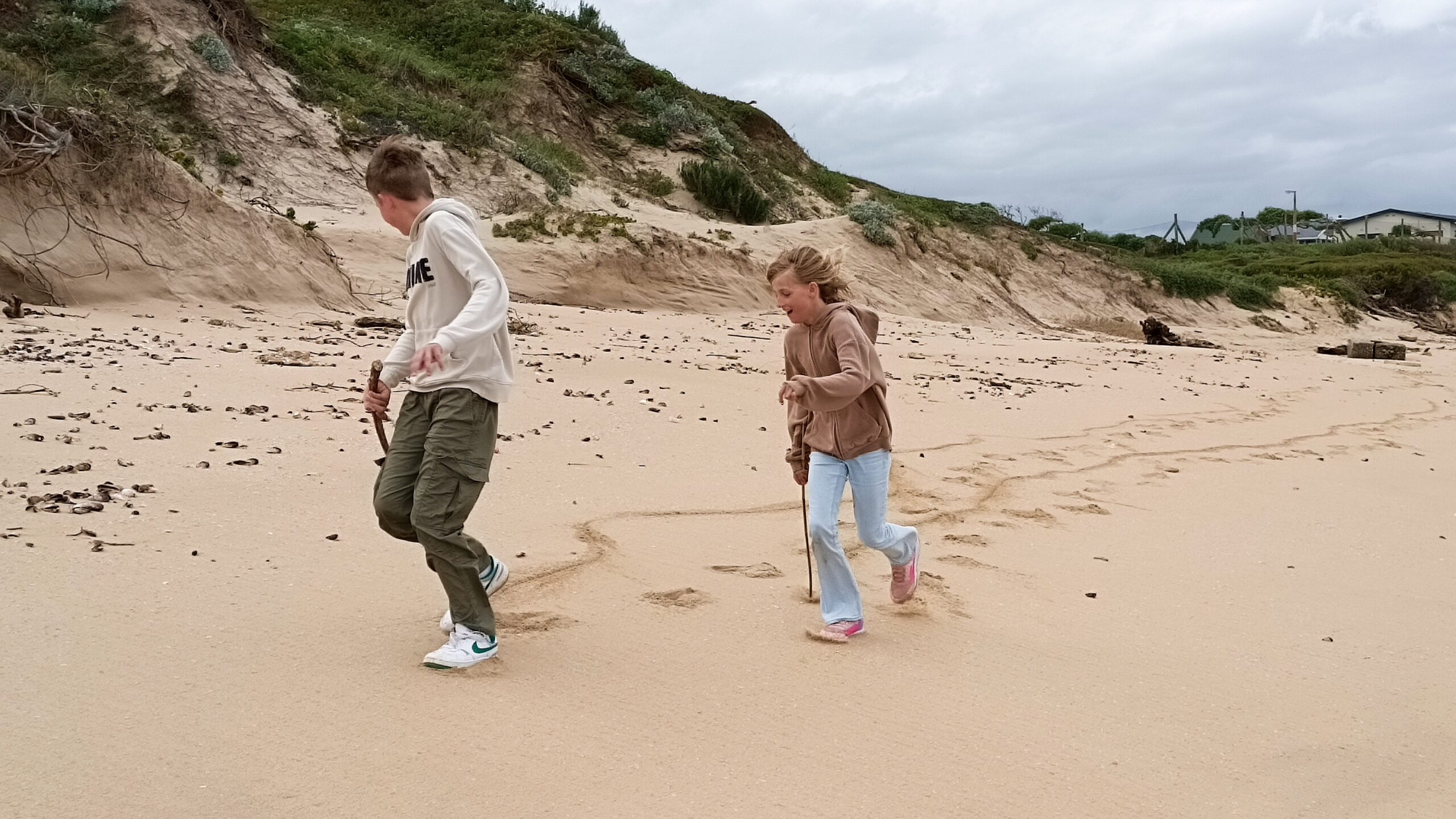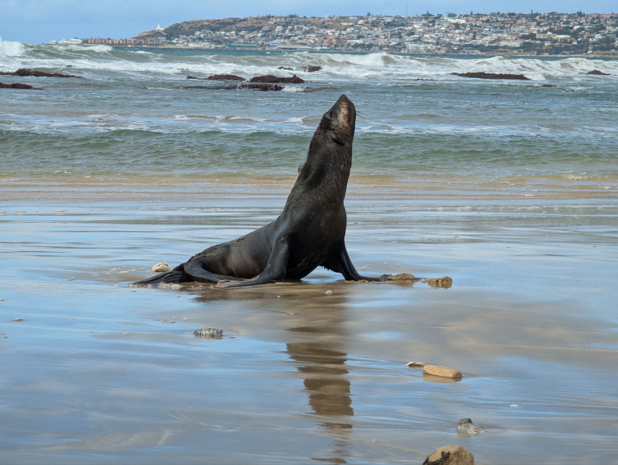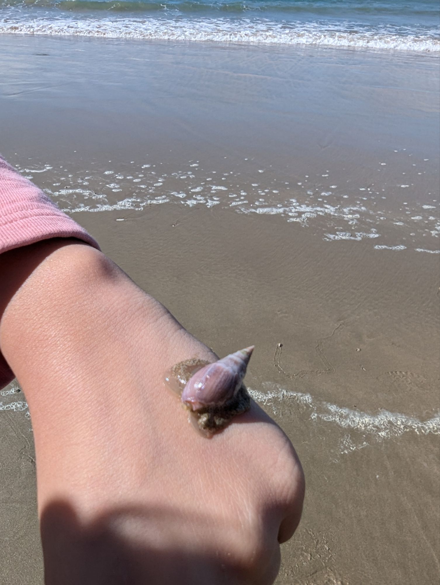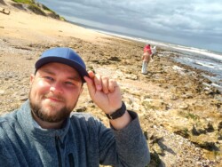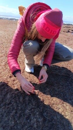 Wir entschieden uns für einen Entdeckungstag am Strand und packten unsere 7 Sachen zusammen. Nach ca. 15 Minuten Fahrt erreichten wir den Diaz Beach, ein langgezogener Sandstrand ungefähr in der Mitte der Bucht. Kräftiger Wind machte alle Hoffnungen auf einen Drohnenflug zunichte. Egal, dann eben ohne! Nach kurzem Fußmarsch erwartete uns schon ein kleiner Seehund🦭, der sich in in der Sonne aalte und kaum Scheu vor Menschen hatte. Die Kids waren fasziniert und wir beobachteten das Schauspiel ausgiebig, bevor wir weiterzogen. Es war gerade Ebbe und damit gab es viel zu zu entdecken. Überall waren kleine Gezeitenbecken, die allerhand Leben bereithielten, das man erforschen konnte🐚🐙🐟🪼🦐. Bennet und Helene hatten kleine Wettbewerbe, damit es spannend blieb. Helene fand das größte und schönste Schneckenhaus und Bennet entdeckte das coolste Tier- einen kleinen, gestrandeten Oktopus. Er sah schon nicht mehr ganz lebendig aus. Nach kurzem Reaktionstest entpuppte sich der kleine 8-armige Freund aber als Kämpfer. Mission „Rettung von Tinti“ begann. Ich fasste mir ein Herz und nahm „Tinti“ auf die Hand…ab zum Wasser! Sofort erwachte der kleine Kerl wieder zum Leben und wurde sehr aktiv. Allerdings hatte er mich fest im Griff und machte keine Anstalten seines Weges zu ziehen. An anderer Stelle ließ er direkt mal eine Tintenwolke los. Kurz darauf wusste ich auch warum. Ein weiterer , größerer Arm näherte sich meiner Hand aus dem Hinterhalt😯. Da versteckte sich wohl ein gleichartiger Rivale direkt unter dem Felsen. Also neuen Platz suchen und weiterer Freilassungsversuch….ein kleiner Schubs und 2 Tintenwolken später war „Tinti“ frei. Ein fantastisches Erlebnis❤️.