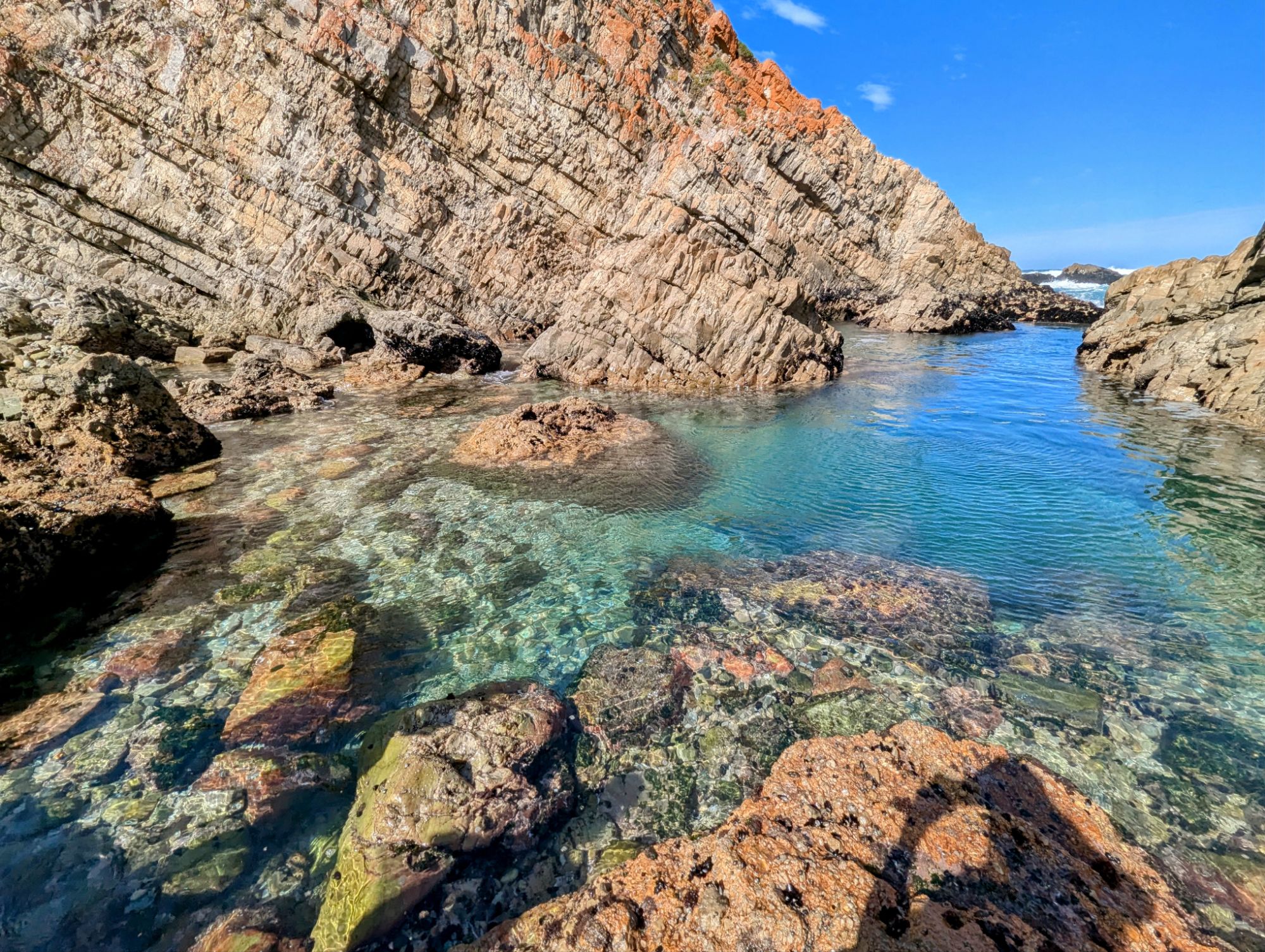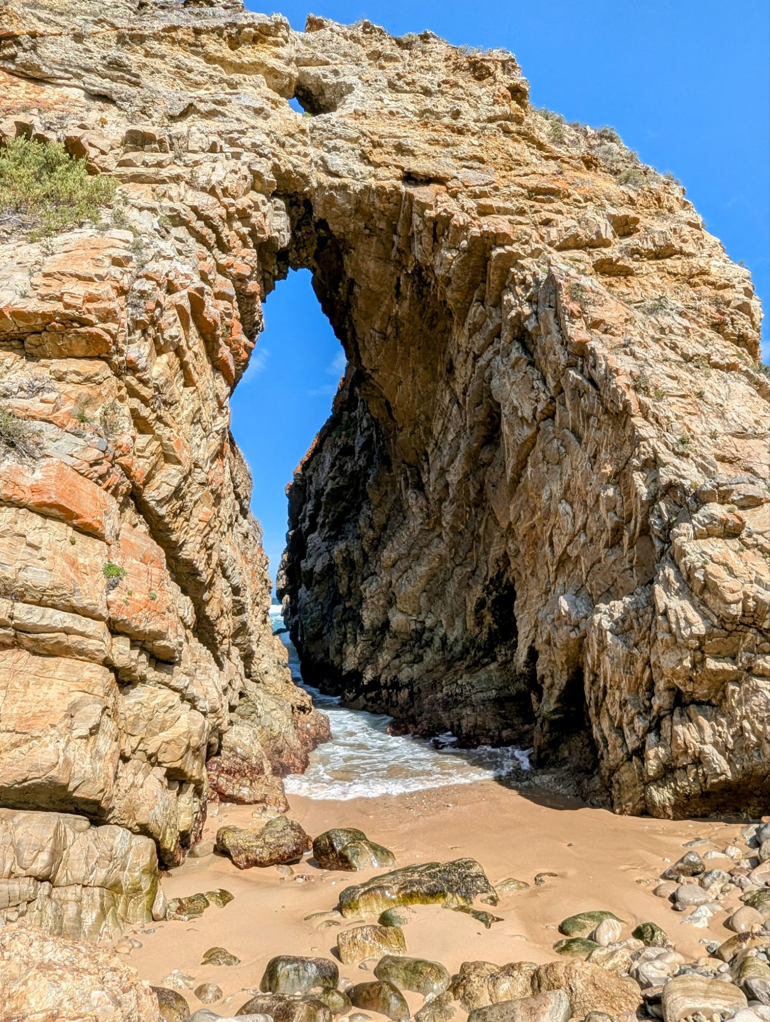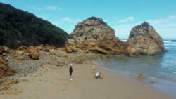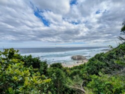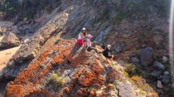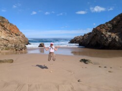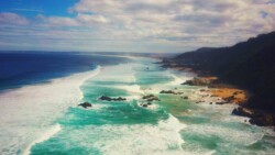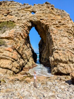 Gegen 12 Uhr war endlich Ebbe und wir konnten uns auf den Weg zum Arch Rock / Cathedral Rock machen. Etwa 30 Minuten ging es einen abenteuerlichen Steilküstenweg entlang. Über Felsen, Klippen, rostige Treppen und teils nur alte Seile, die als Hilfsmittel herhielten. Angekommen am Strand ging es auf Entdeckungstour. Die Gegend ist unheimlich schön. Ein riesiger Felsen mit einem Tunnel zum Meer, der Cathedral Rock, gab eine tolle Fotoperspektive. Toni nutzte die Gelegenheit und flog mal mutig durch. Klare, geschützte Pools in mitten der Brandung luden zum Schwimmen ein, was uns aber dann doch zu kühl war.