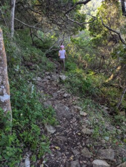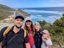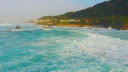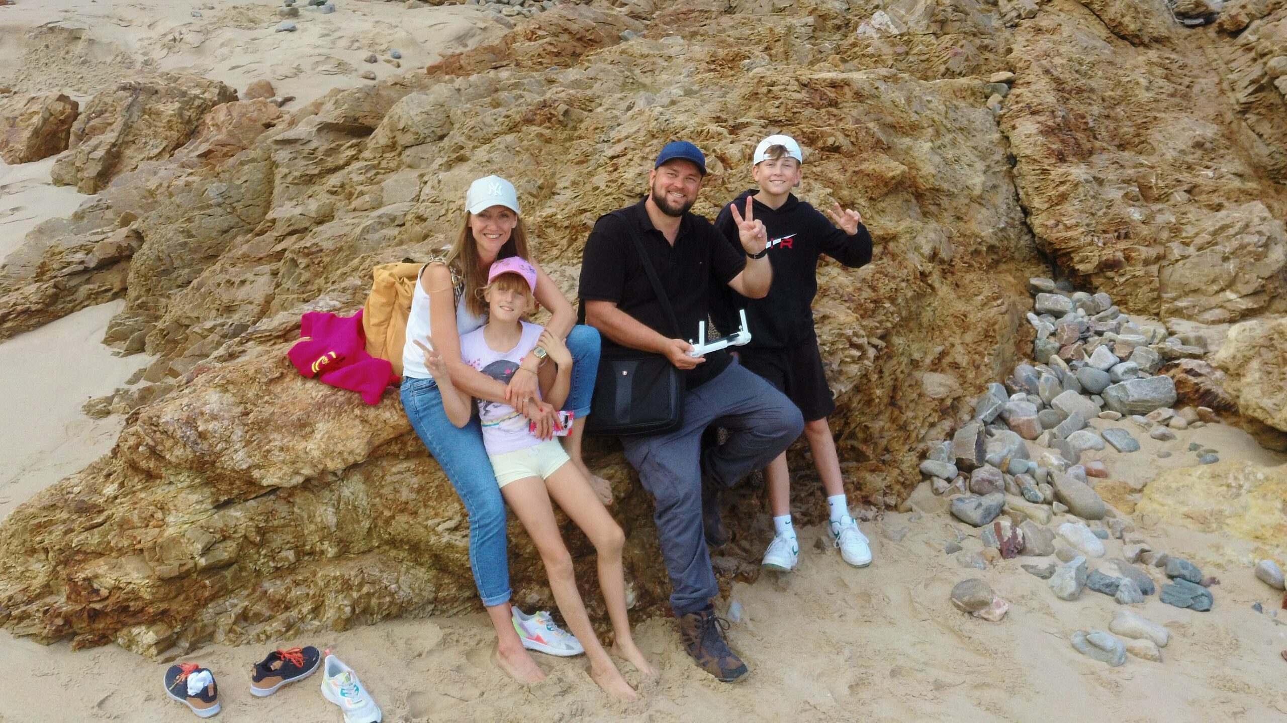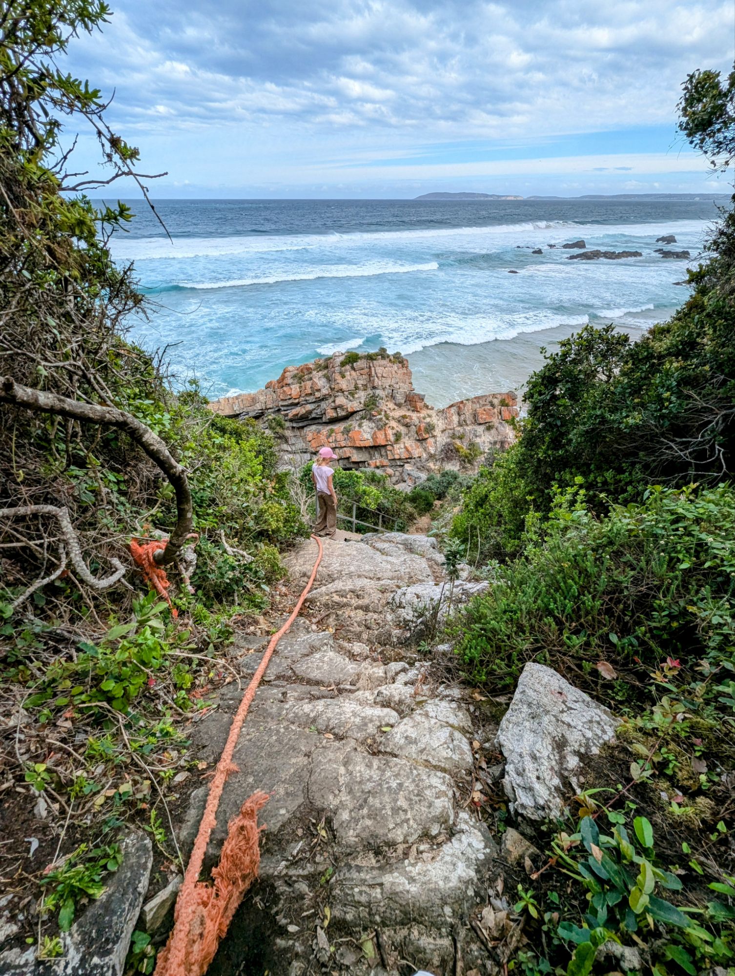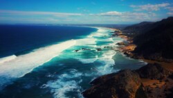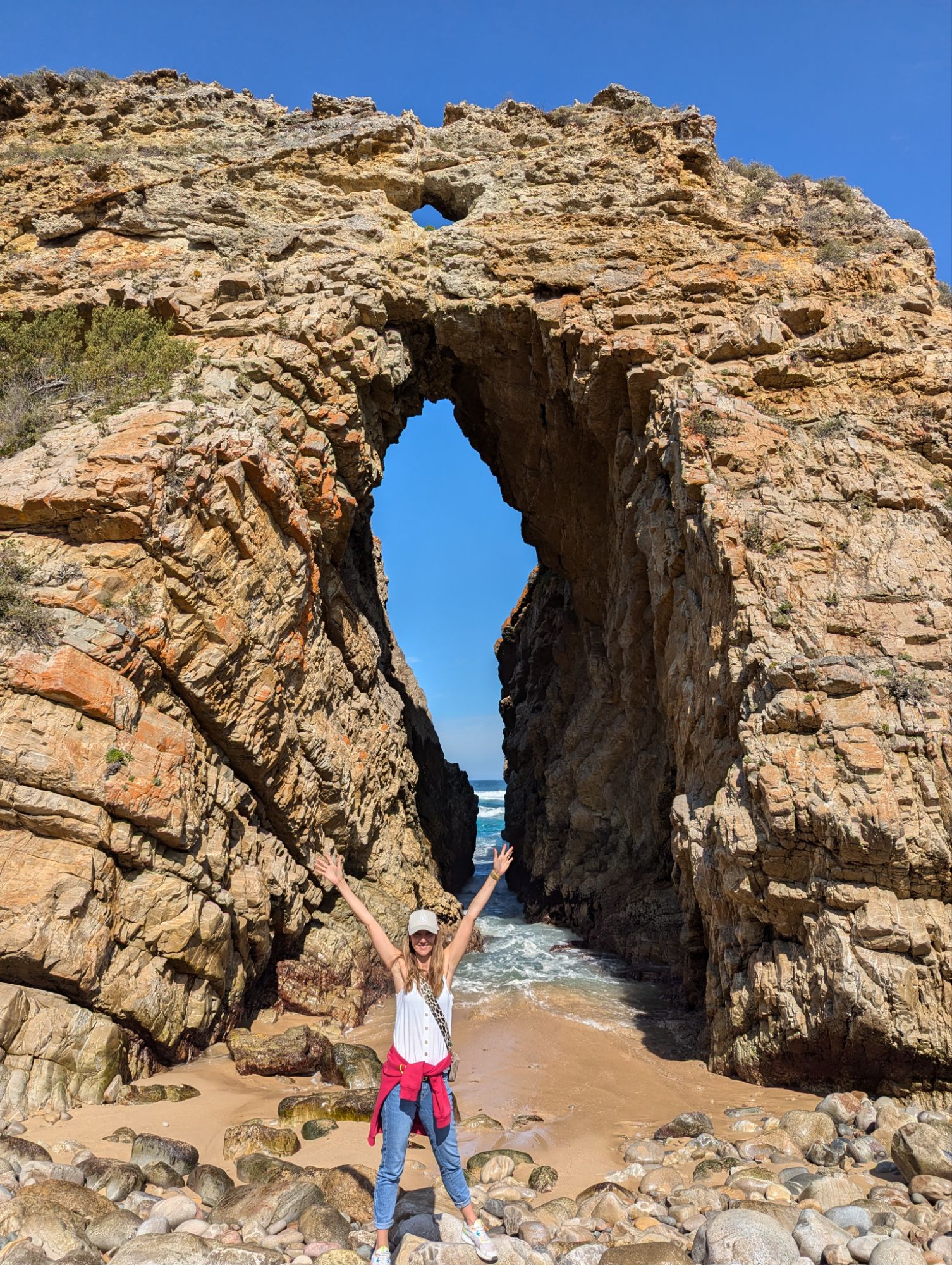 Gegen 12 Uhr war endlich Ebbe und wir konnten uns auf den Weg zum Arch Rock / Cathedral Rock machen. Etwa 30 Minuten ging es einen abenteuerlichen Steilküstenweg entlang. Über Felsen, Klippen, rostige Treppen und teils nur alte Seile, die als Hilfsmittel herhielten. Angekommen am Strand ging es auf Entdeckungstour. Die Gegend ist unheimlich schön. Ein riesiger Felsen mit einem Tunnel zum Meer, der Cathedral Rock, gab eine tolle Fotoperspektive. Toni nutzte die Gelegenheit und flog mal mutig durch. Klare, geschützte Pools in mitten der Brandung luden zum Schwimmen ein, was uns aber dann doch zu kühl war.