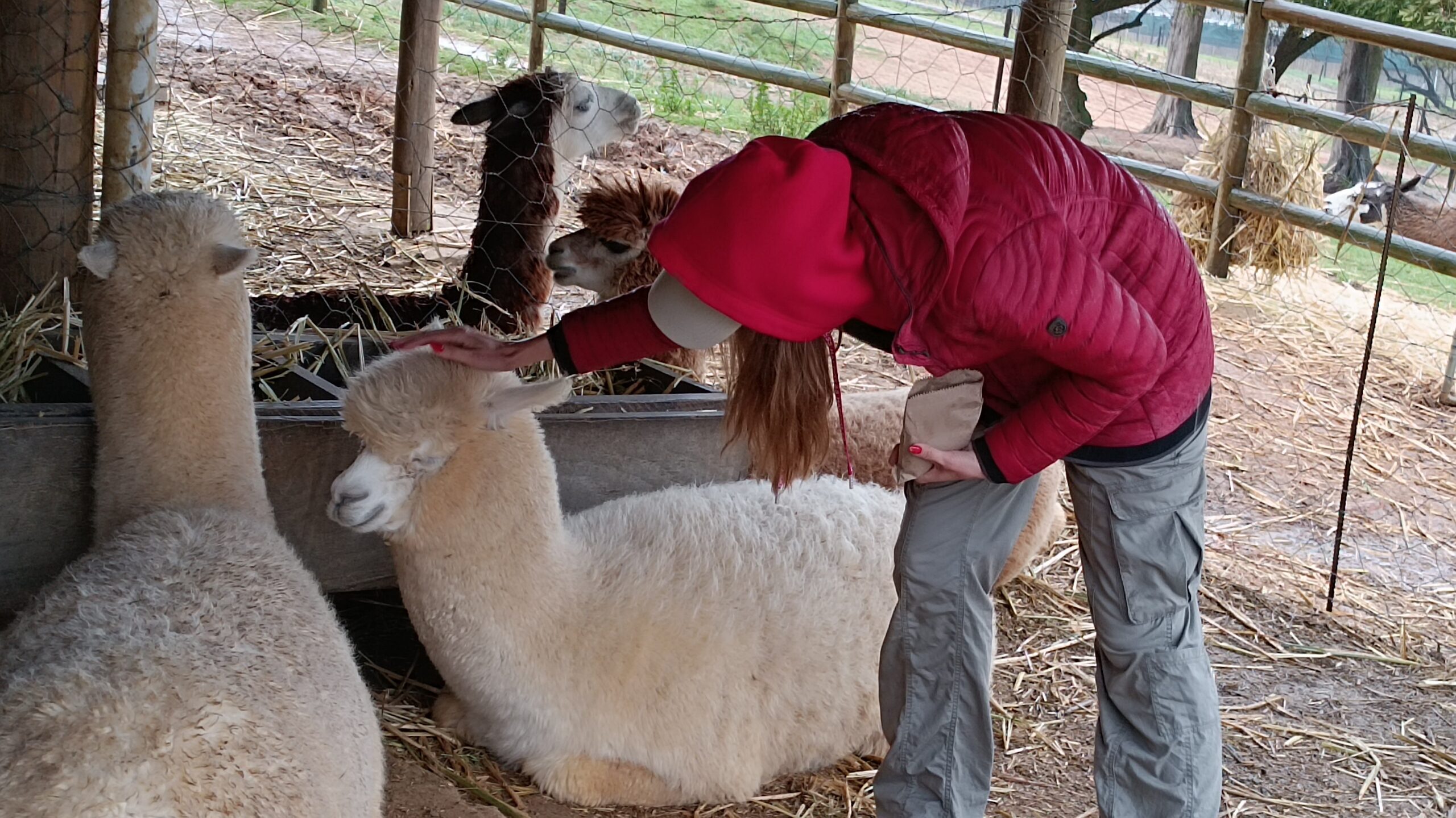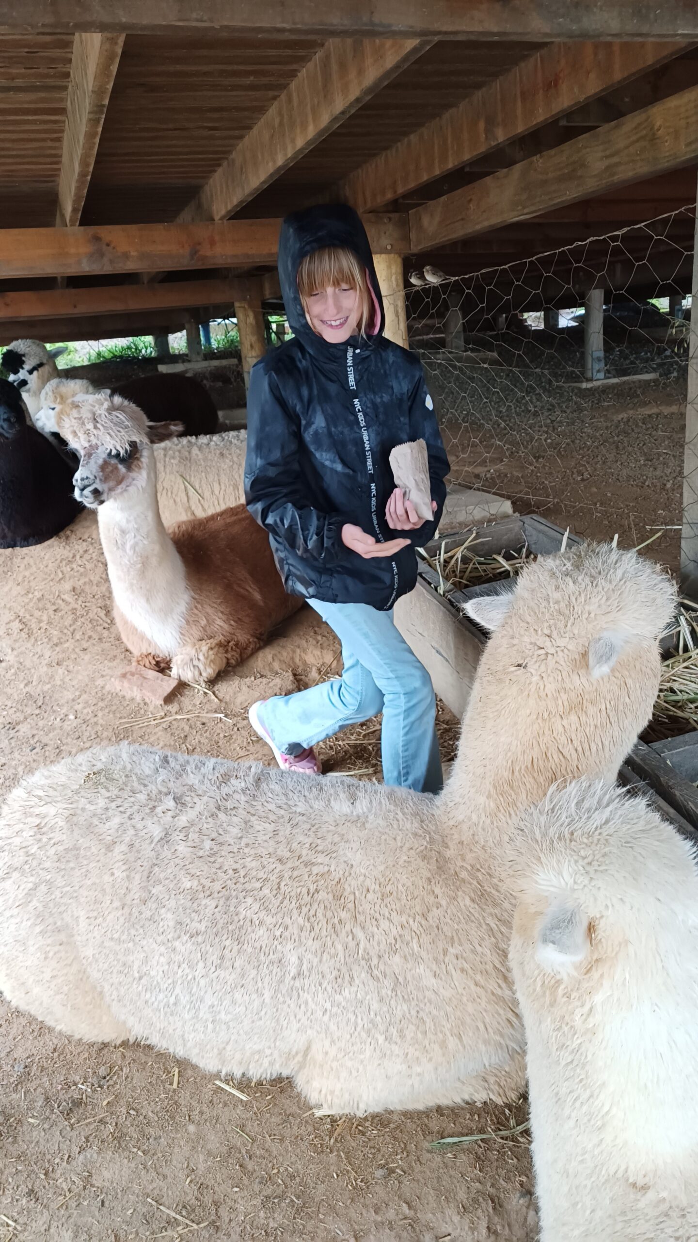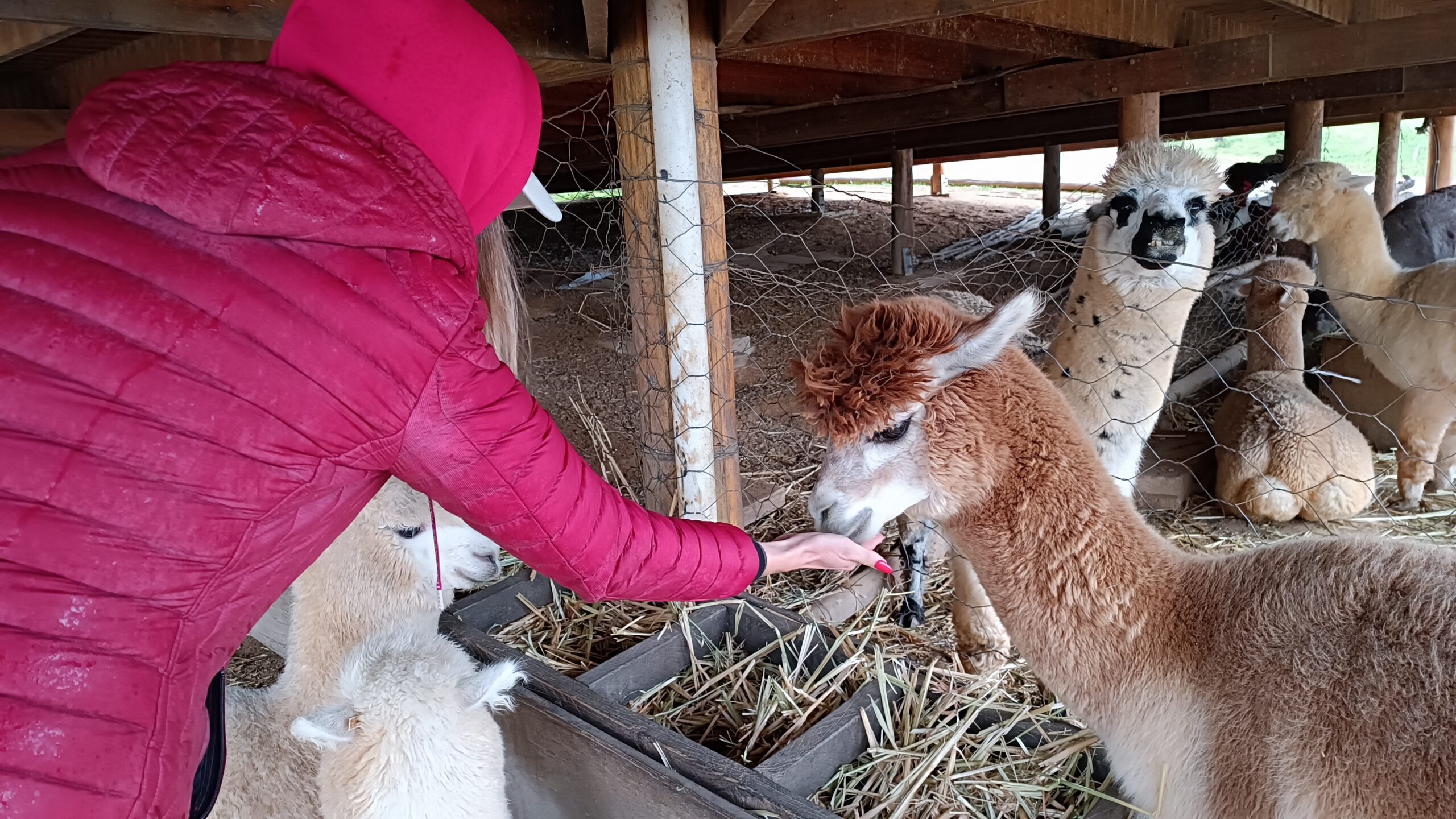 Frisch gestärkt und aufgewärmt konnte es endlich losgehen. Schnell noch Futter kaufen und dann ab nach draußen. Direkt unter der Terrasse kuschelten sich zahlreiche Alpakas, Lamas und Hähne zusammen🦙❤️. Die mochten das Wetter wohl auch nicht. Gierig futterten die flauschigen Tierchen direkt aus der Hand. Ein schönes Erlebnis! Noch ein kurzer Abstecher zu den gefräßigen Ziegen, dann waren wir alle pitschnass und durchgefroren.